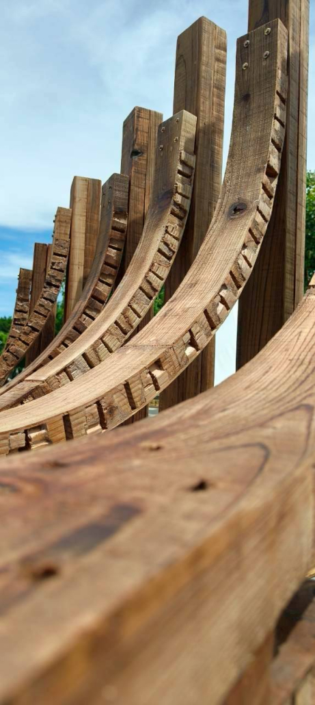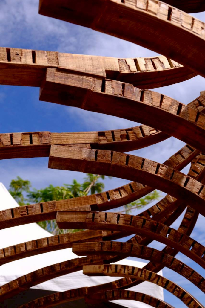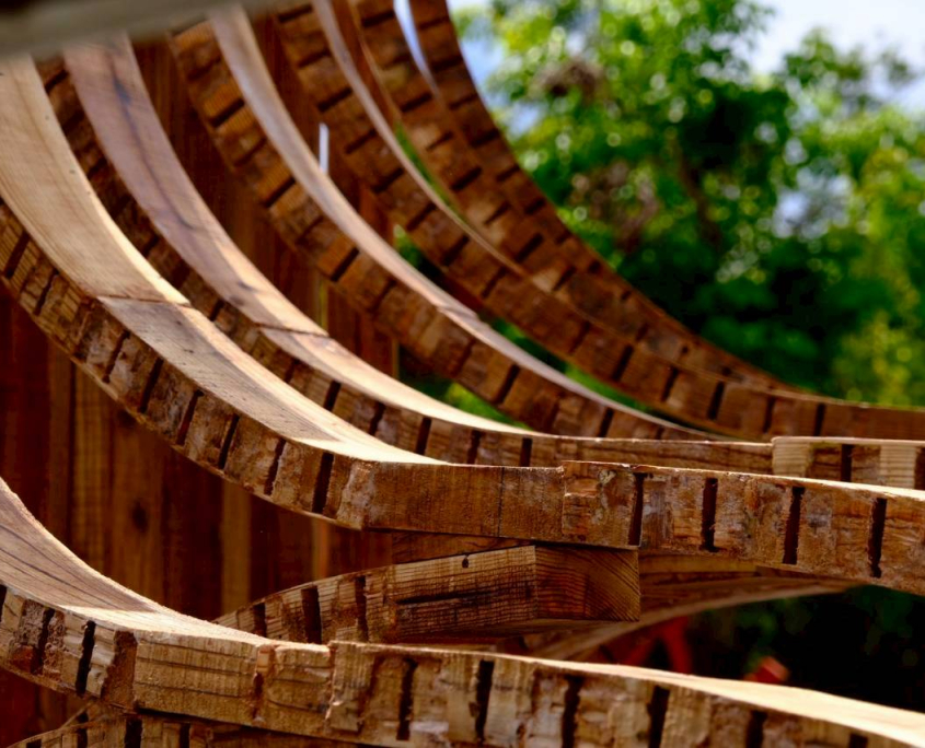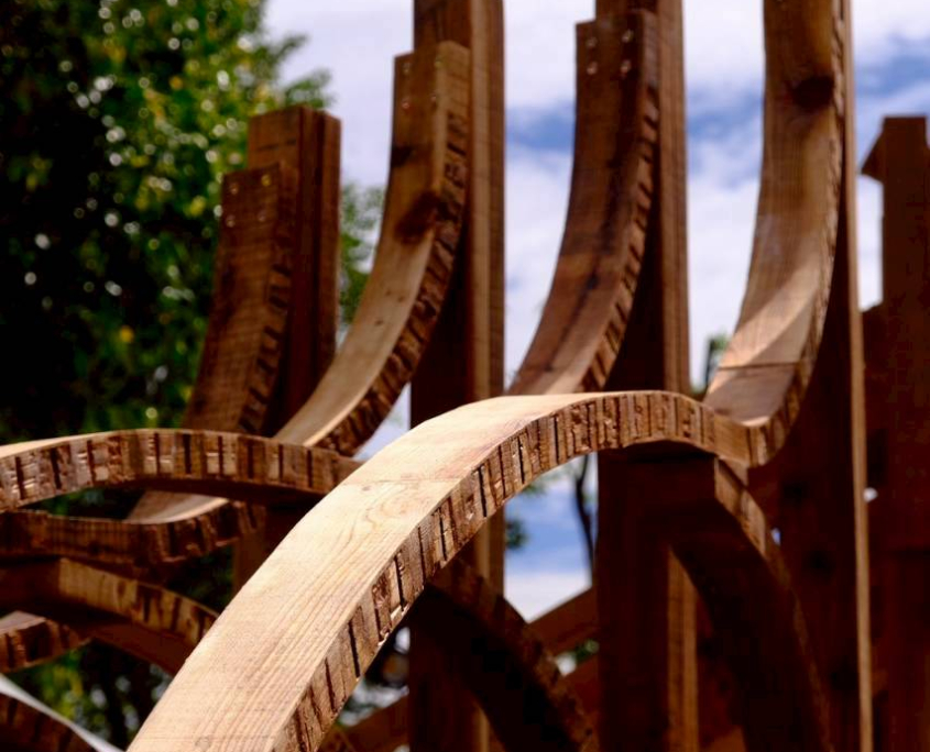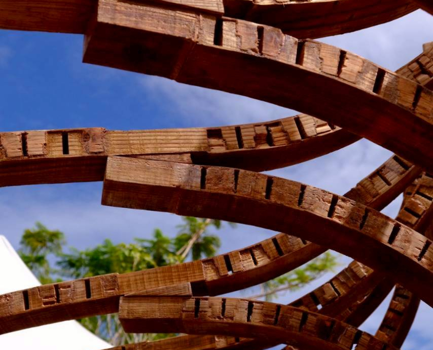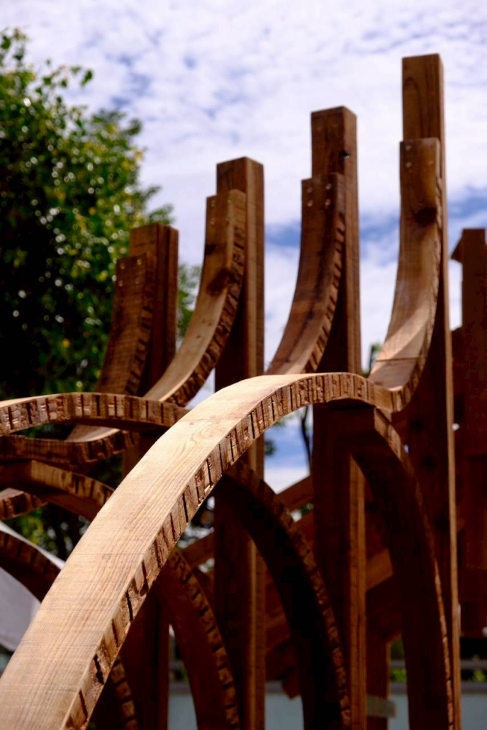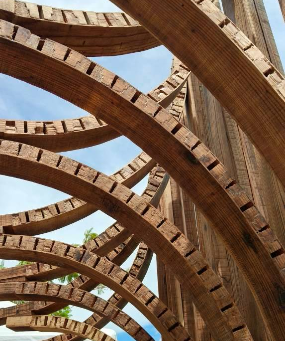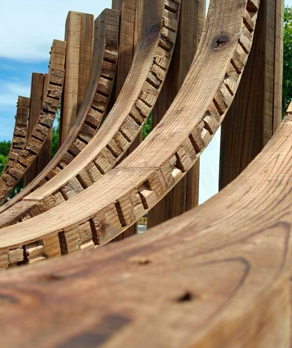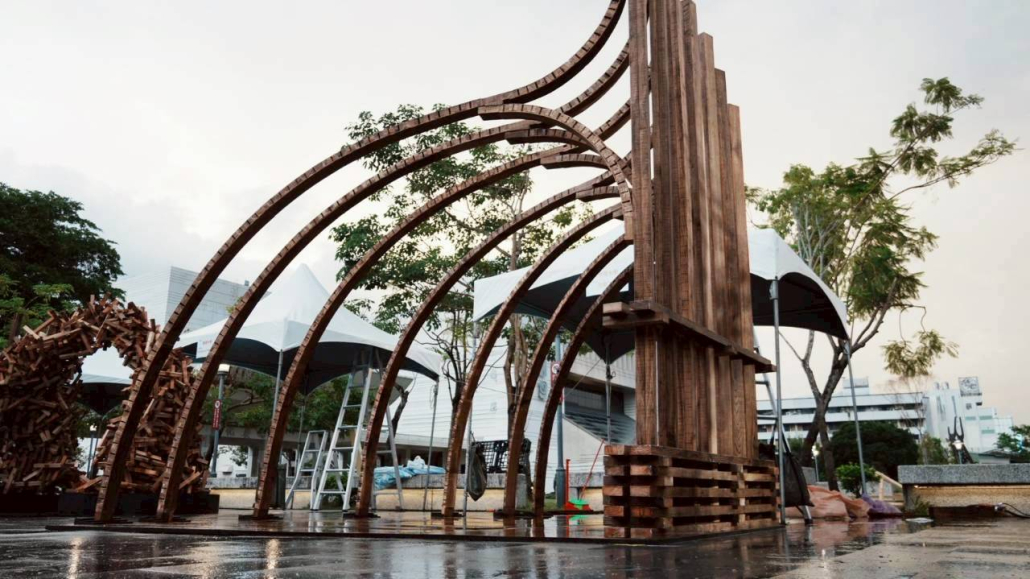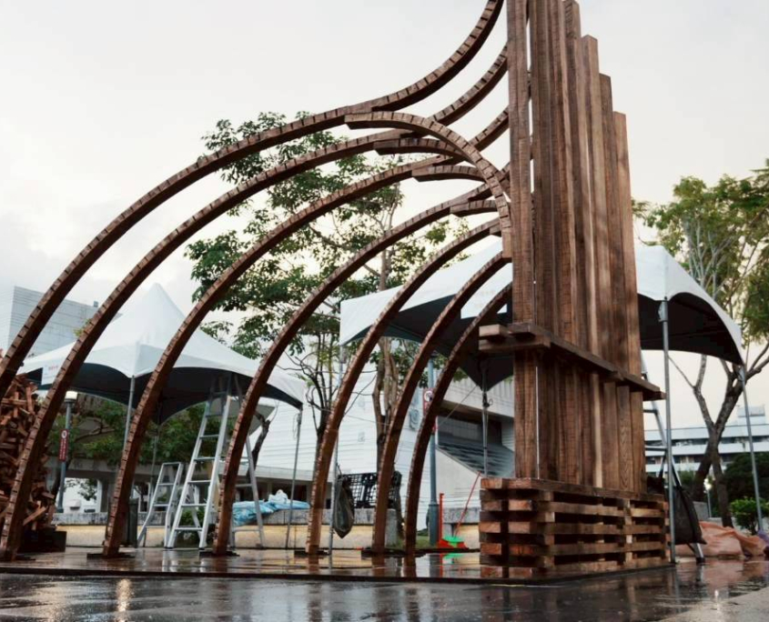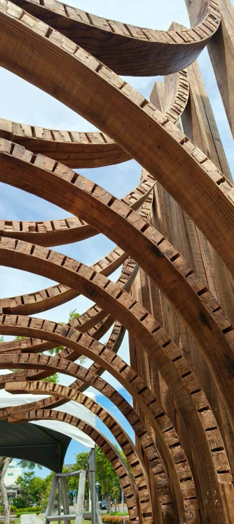 以嘉義北回歸線的日光為起點,將四季光影化為結構的語言。陽光的軌跡刻畫時間流轉,也映照著嘉義木業的興衰歷程。木材在彎折與拼合中重獲新生,映照嘉義木都由盛轉衰後,再次綻放的可能。