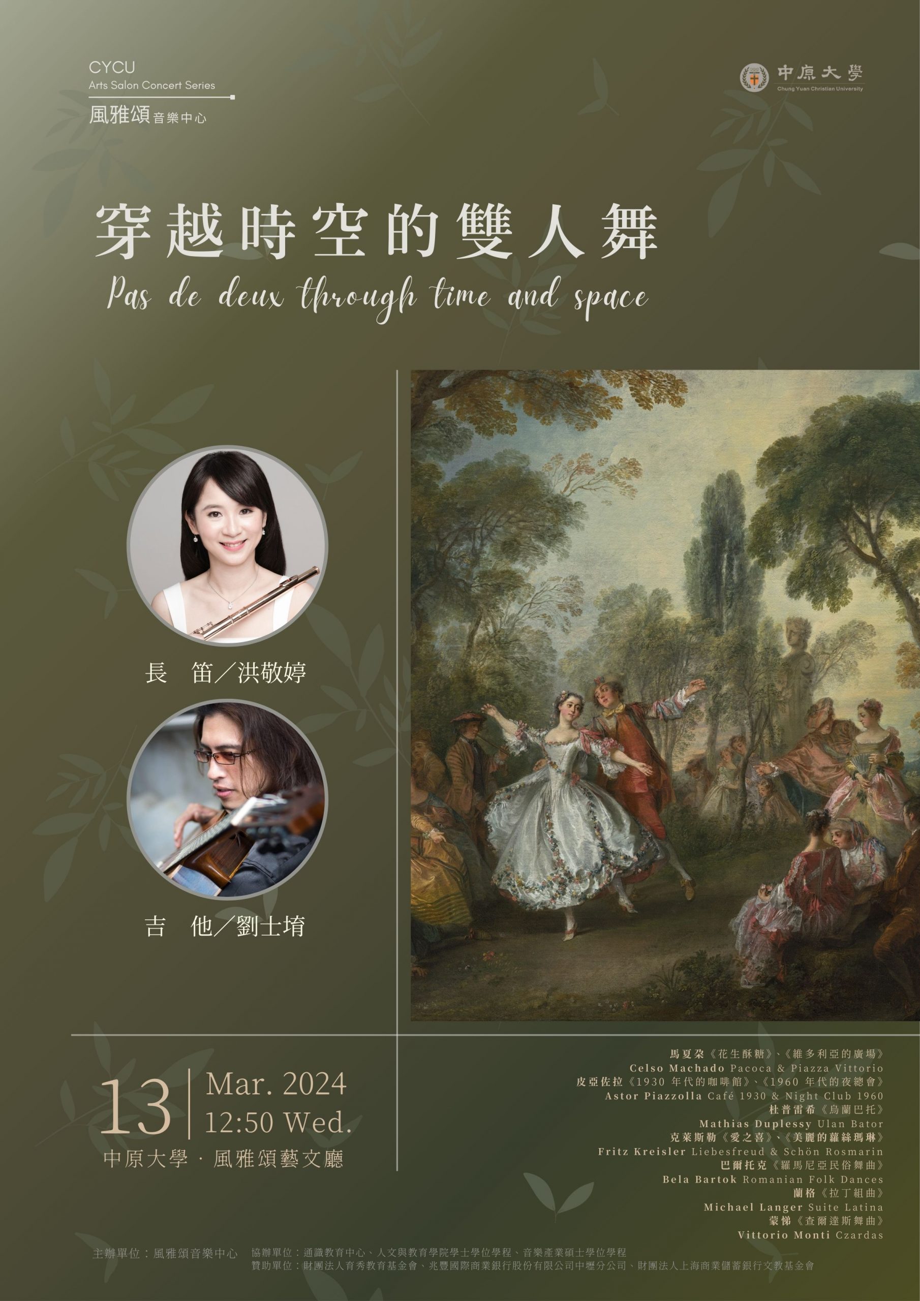 活躍於國內外樂壇的長笛演奏家洪敬婷與吉他演奏家劉士堉,將為大家獻上多首經典、迷人的長笛與吉他二重奏樂曲;這次精心企劃以「舞曲」貫穿整場音樂會,從巴洛克時期的小步舞曲、嘉禾舞曲,到浪漫時期的維也納圓舞曲,以及融合古典與爵士風的探戈舞曲與熱情奔放的佛朗明哥舞曲…等穿越時空橫跨好幾個世紀的特色舞曲,期待透過演奏家們與聽眾近距離分享,以精湛技巧演奏與自然音樂性詮釋,將音樂的情緒與感染力,巧妙渲染而感動您們的心靈深處!