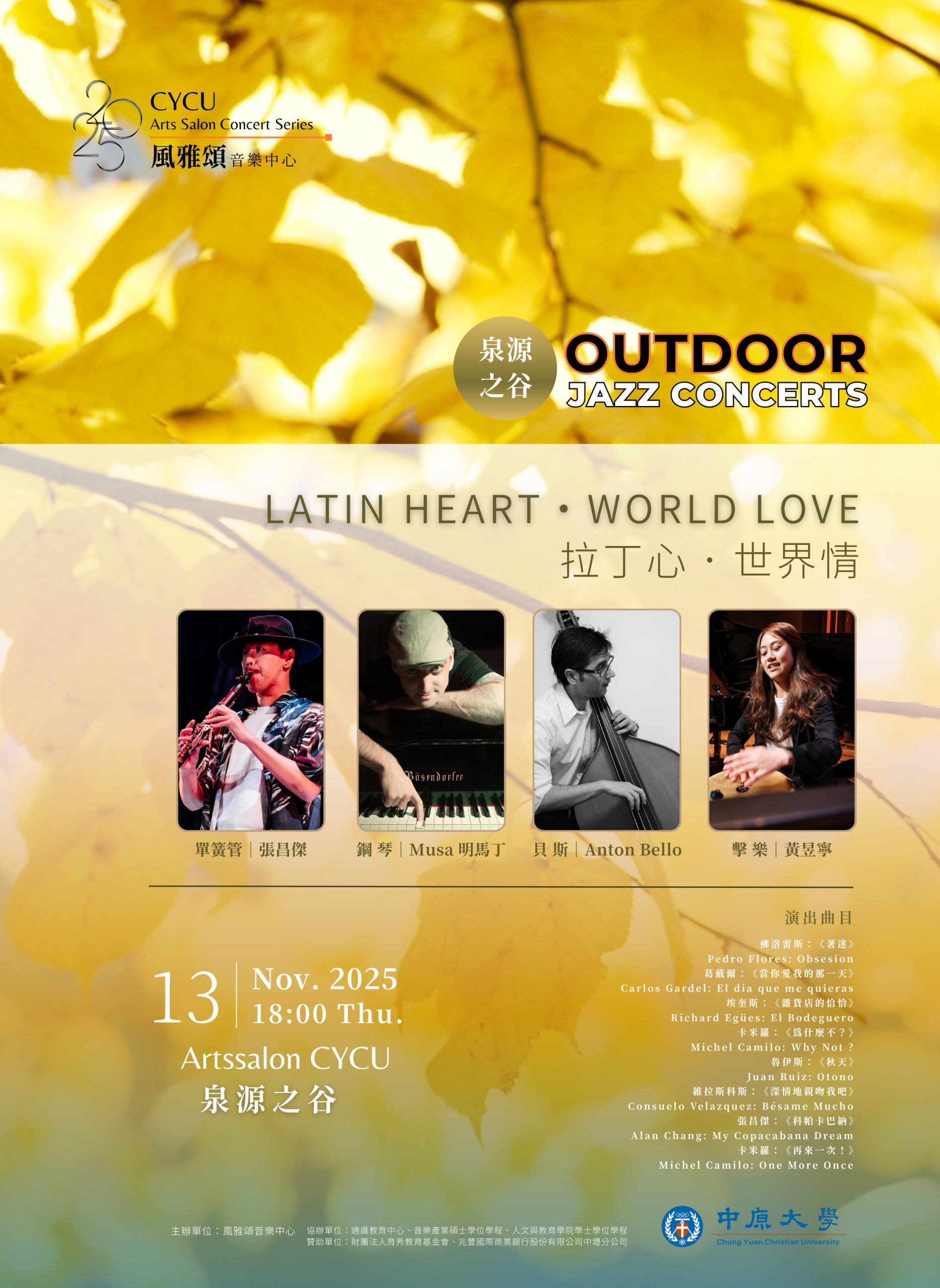 單簧管演奏家張昌傑為近年來十分活躍的爵士音樂家、策展人,其音樂風格涵蓋爵士、古典、流行、拉丁、Fusion、Funk和世界音樂等,演奏經驗豐富,多元且實力兼備,深受觀眾喜愛。本次演出邀請樂極具影響力之金曲獎得主,來自阿根廷的新台灣人鋼琴手MUSA明馬丁、西班牙貝斯手Anton Bello、打擊黃昱寧共組世界與拉丁四重奏,為了讓樂迷及師生能近距離感受到來自世界不同國家及金曲獎等級之專業熱情的樂團演奏,特別設計規劃了一場拉丁音樂與世界音樂及原創曲目等豐富多元的曲目內容。整場音樂會內容在節目設計及互動感受上皆十分親民,非常適合所有師生與樂迷民眾們聆聽欣賞!