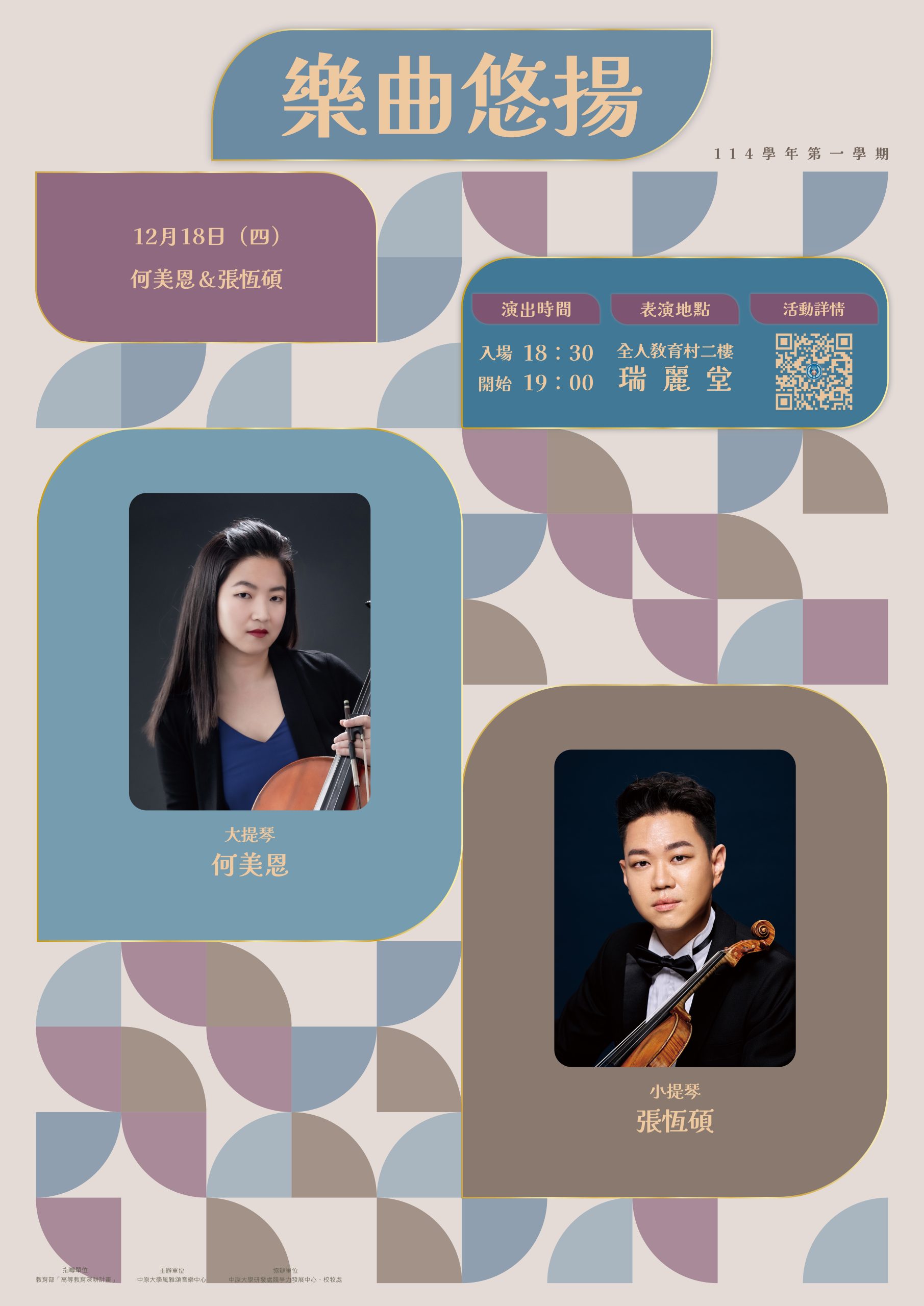 這場音樂會以弦樂為主,曲目由大提琴獨奏開場,從美國青年女作曲家Caroline Shaw到國內知名作曲家黃輔棠老師,有著中西方音樂的對比。之後將會有小提琴和大提琴的二重奏,包含大家耳熟能詳的民歌改編、印象派法國作曲家拉威爾的二重奏、以及知名的韓德爾/哈佛森的「帕薩加利亞舞曲」作為結尾。
