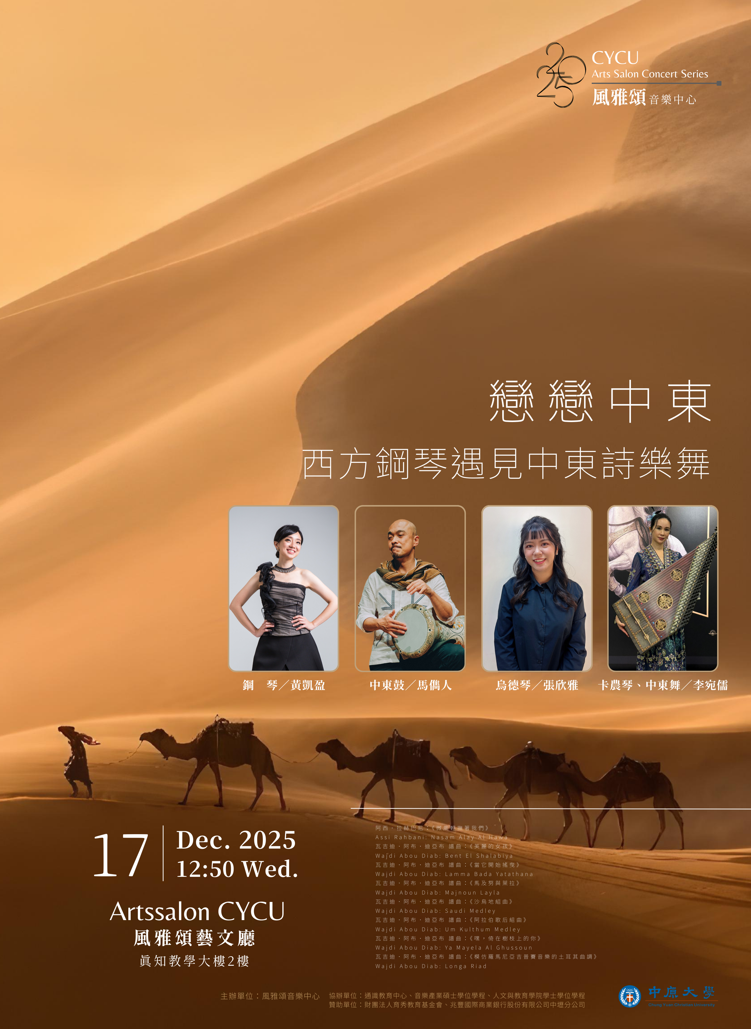 與黎巴嫩作曲家Wajdi Abou Diab合作的阿拉伯詩樂舞曲目,中東音樂神秘迷人,特點在於微分音,由於鋼琴等西方樂器除非經過特調無法演繹微分音,作曲家Wajdi改編經典中東曲目,讓鋼琴也能與中東樂器、詩詞、舞蹈對話,在輕鬆的氛圍,增進對中東音樂文化的理解。