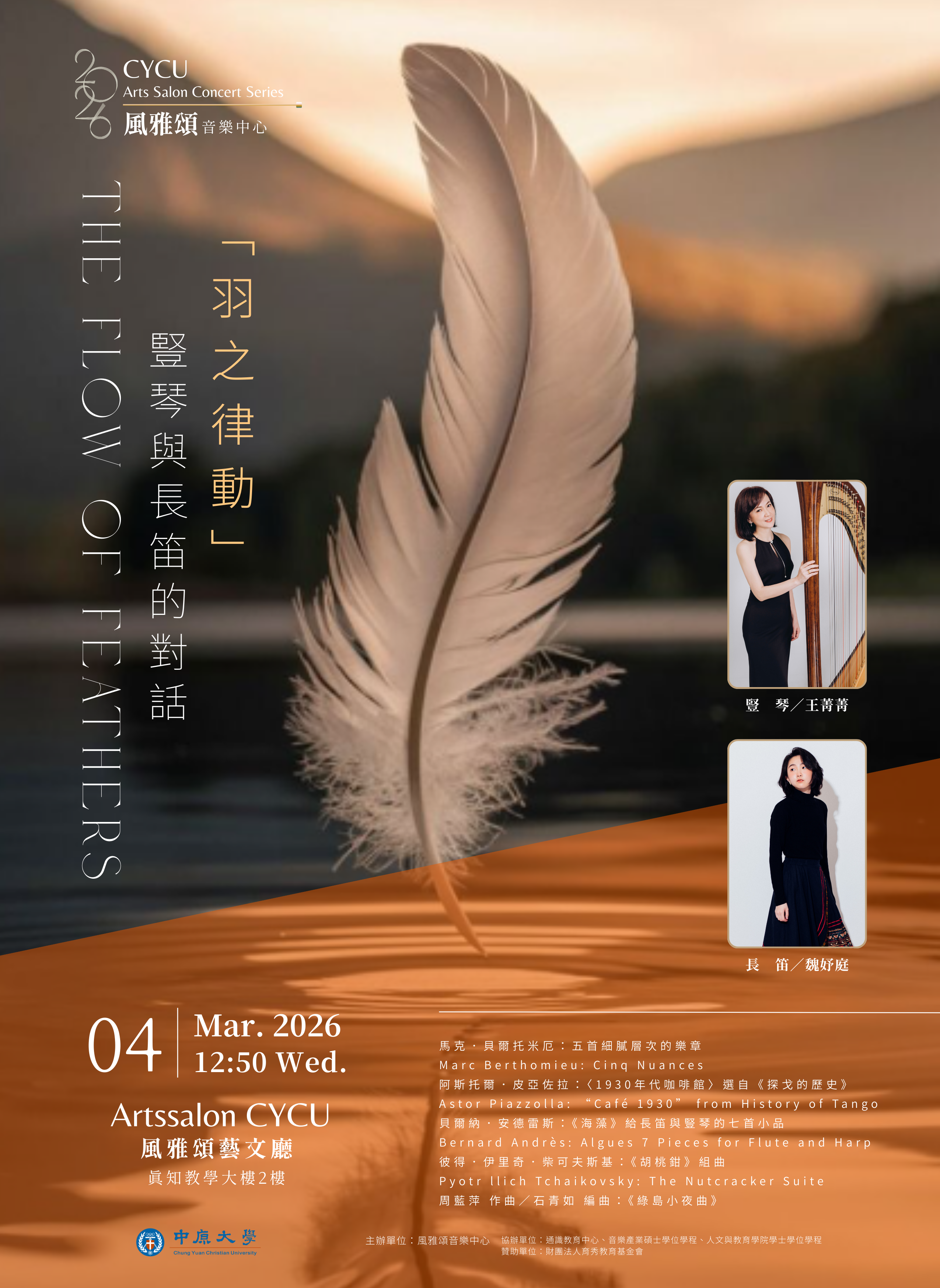 豎琴與長笛的對話中-豎琴家指尖輕撥琴弦,靈動音符如月光傾瀉,時而悠揚婉轉,時而磅礡大氣;長笛家音色清新、明亮清澈,具有穿透力且展現出多變的情感與色彩。本場音樂會將穿梭於近代幾位極具特殊風格的作曲家-Marc Bethomieu作品,充滿法式旋律的細膩與優雅,擅長在音符間描繪詩意場景;來自阿根廷Astor Piazzolla則以獨特的新探戈風格,將拉丁節奏與古典語法結合,為整場音樂會注入濃烈的生命力與動感;而法國豎琴演奏家Bernard Andrès作品「Algues」,注重音色的空間感及意象的描寫,頗有光線在水中折射的朦朧色彩。