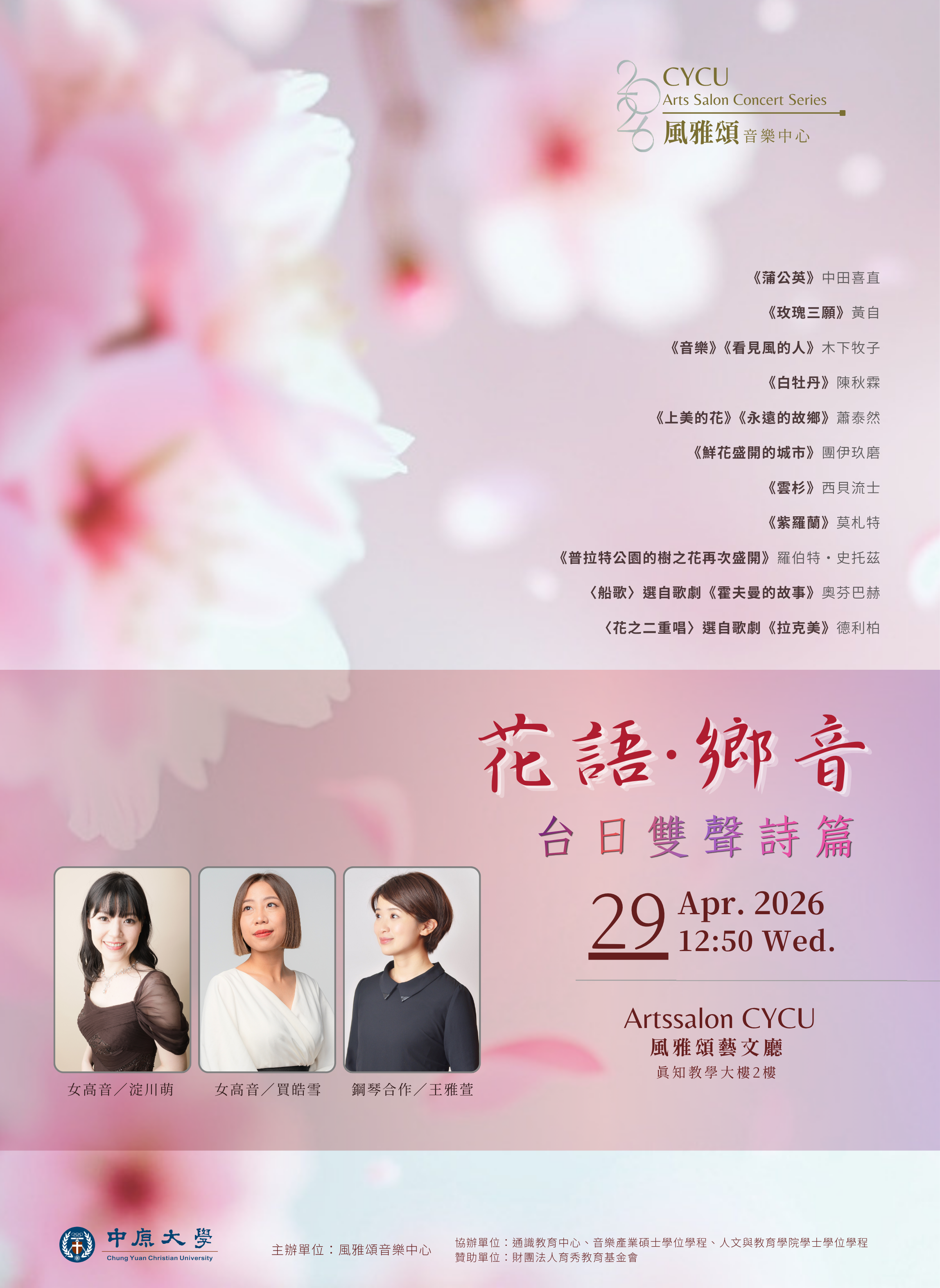 來自台灣與日本的音樂家,以「花」與「故鄉」為意象,透過歌聲與琴音編織出一幅春日詩篇。本場音樂會精選多首橫跨不同文化與時代的聲樂作品,從日本作曲家中田喜直《蒲公英》、木下牧子《看見風的人》,描繪春光與微風的細膩流動;到團伊玖磨《鮮花盛開的城市》與蕭泰然《永遠的故鄉》,在旋律中流露對土地與記憶的深刻情感。最後則帶來歐陸經典之作,包括莫札特《紫羅蘭》、德利伯《花之二重唱》與奧芬巴哈《船歌》,展現不同語言與音樂風格中的優雅與抒情。演出將穿插導聆,引領聽眾從旋律、語言與情感層層進入作品,感受音樂如何跨越文化,連結彼此的記憶與想像,在聲音中看見花開,也聽見故鄉。