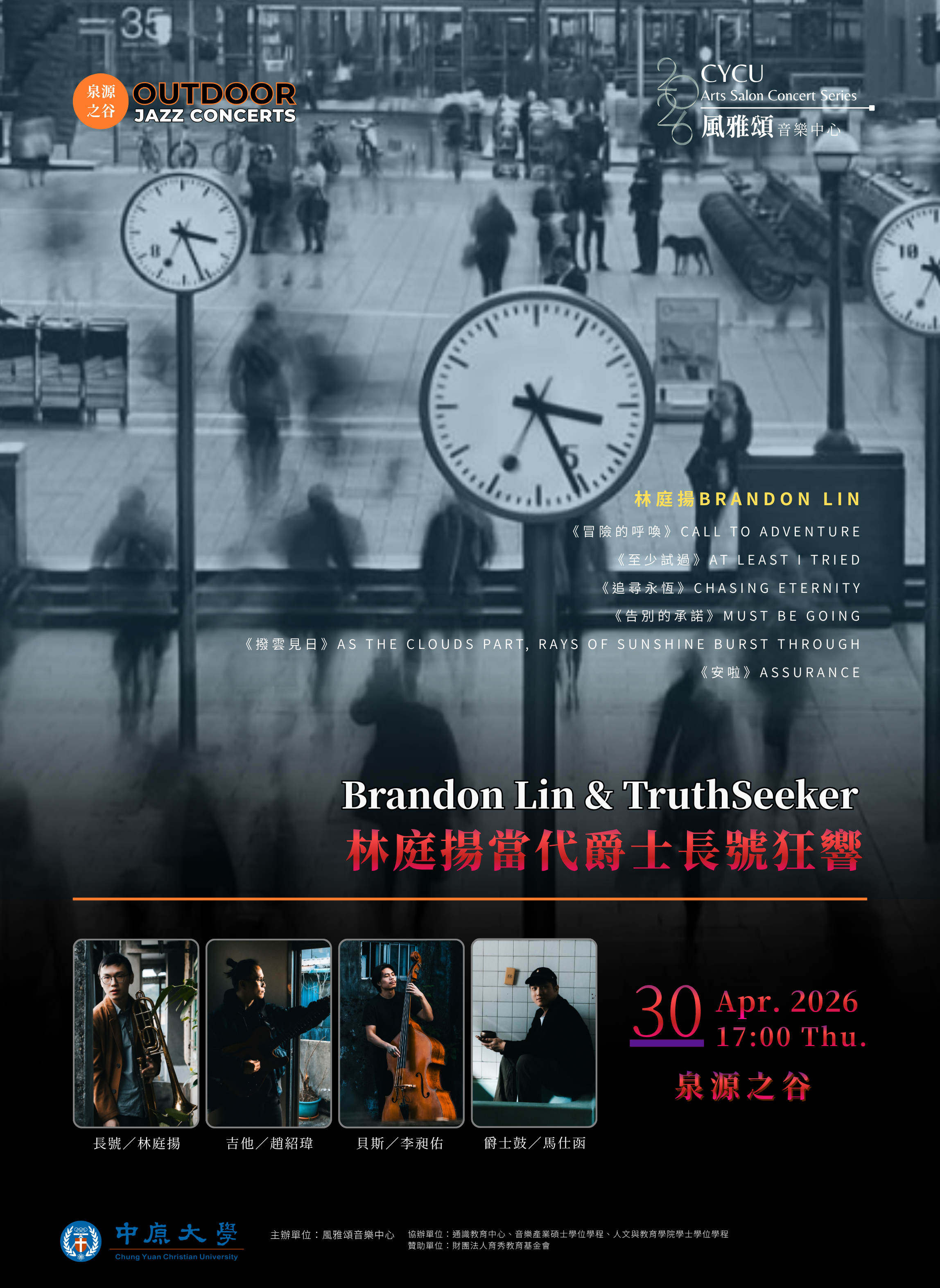 Brandon Lin & TruthSeeker 以長號為聲音核心,融合效果器、電吉他、貝斯與爵士鼓,構築出獨特的聲響實驗。樂團所追尋的並非宏大的人生哲理,而是試圖剝離社會賦予的思考框架,引領聽者在時間永不停歇的流動中體驗內在情緒與生命經驗。