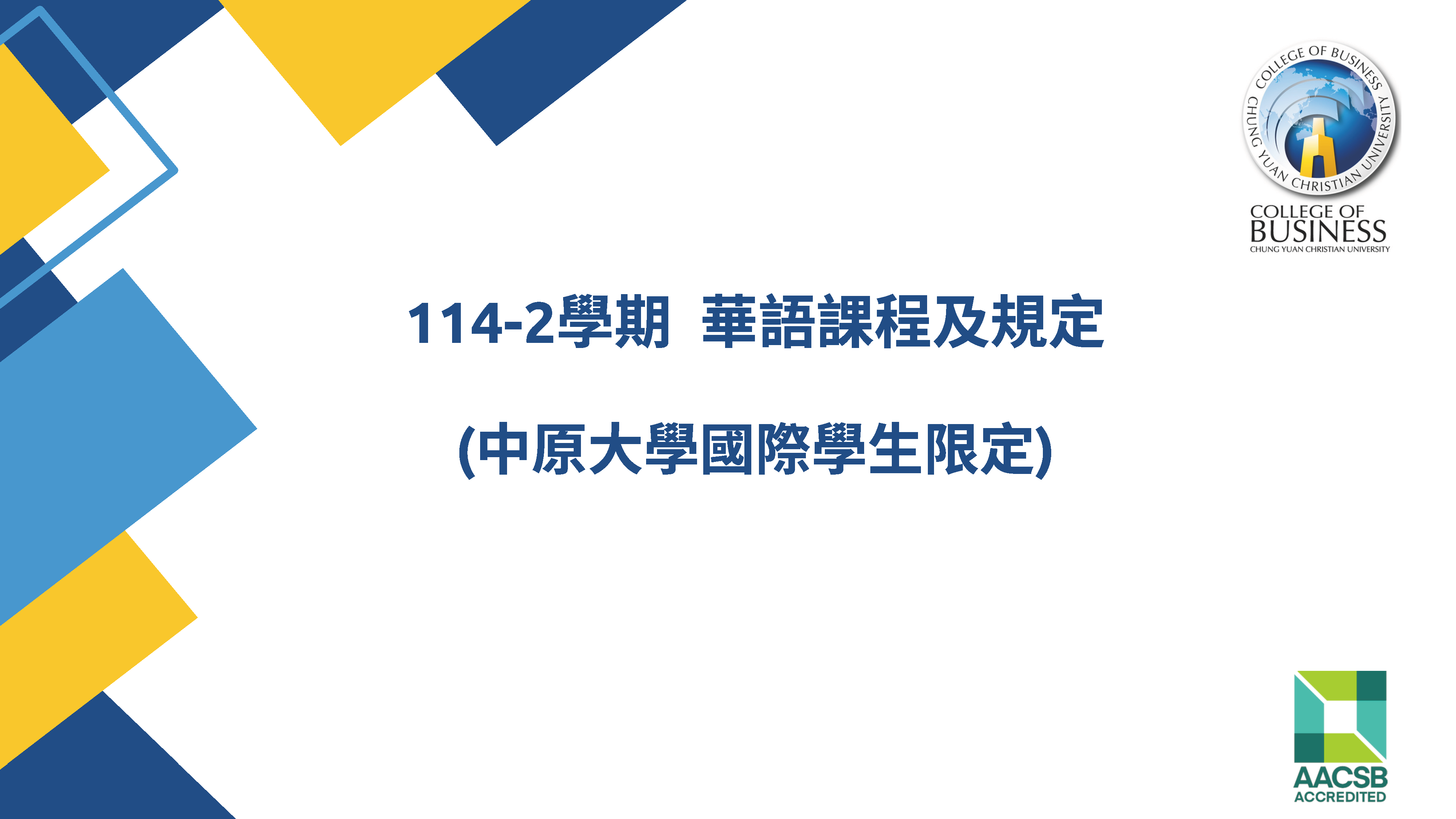 114-2學期【華語課程時間及規定】 2025-12-22 最新消息 / 綜合公告 中原大學開課查詢系統:https://itouch.cycu.edu.tw/active_system/CourseQuerySystem/ 中原大學選課系統:https://myself.cycu.edu.tw/#/login 114-2學期【華語課程時間及規定】