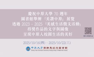 迎接中原大學70週年校慶,秘書室公共事務中心特別策劃「中原70輝煌」校慶特展,精選本校在「創新教學、研究發展、產學合作、友善校園、深耕國際、永續發展、校友的光」七大面向的成果亮點,展現中原師生齊心努力的印記與榮耀。