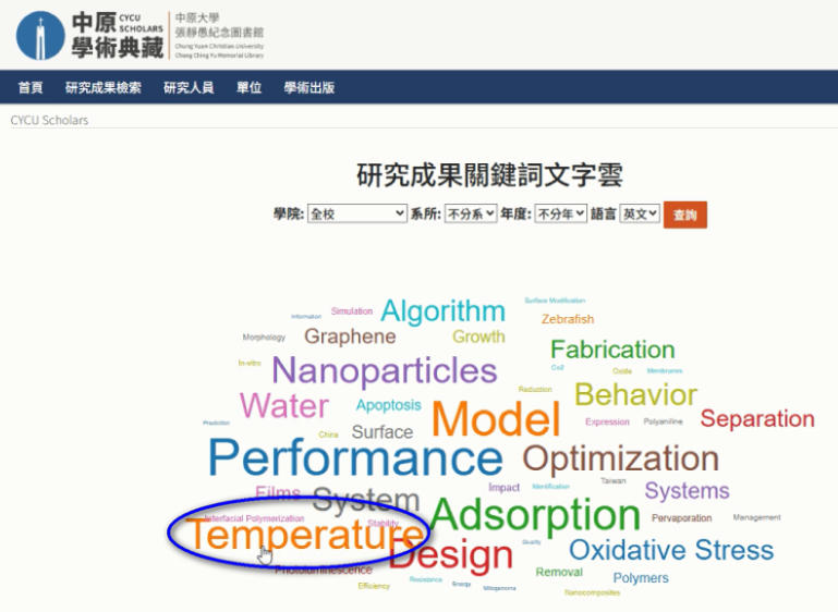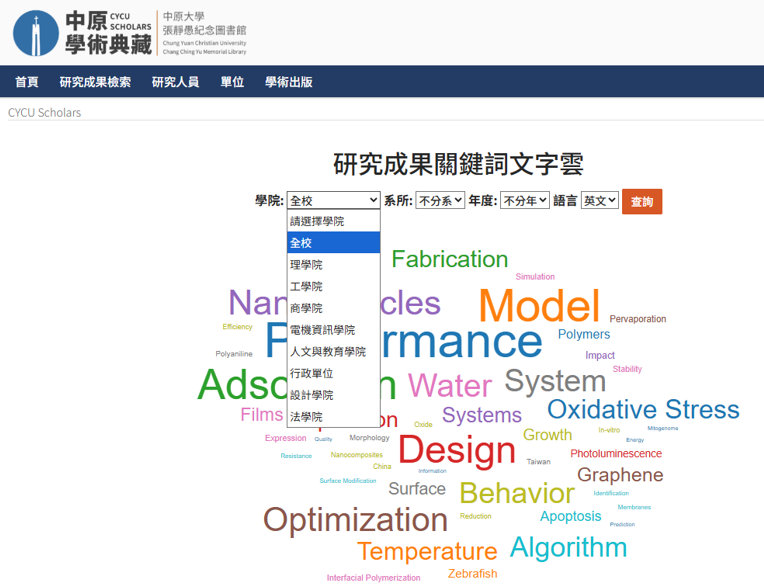文字雲的加入,讓中原學者十餘年來的研究成果不再只是靜態清單,而成為可觀察、可互動、可預測未來研究方向的資訊視窗。從材料科技到永續議題、從電資發展到社會實踐,中原跨領域研究能量得以透過新的呈現方式更加聚焦且具吸引力。