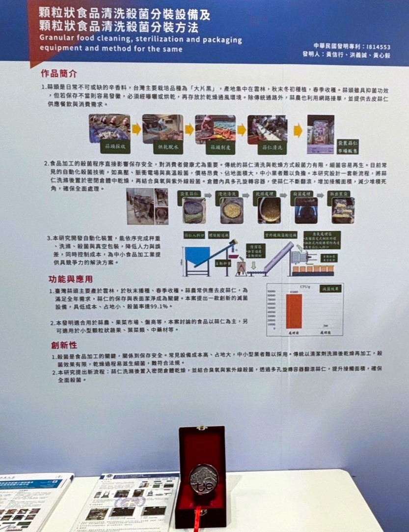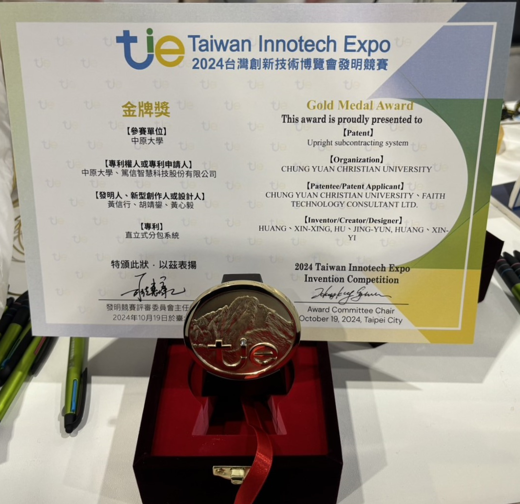 在2024年博覽會中,黃教授團隊以發明專利【直立式分包系統】(專利號:I814607)榮獲金牌獎,展現於自動化包裝與分包技術領域的創新突破。