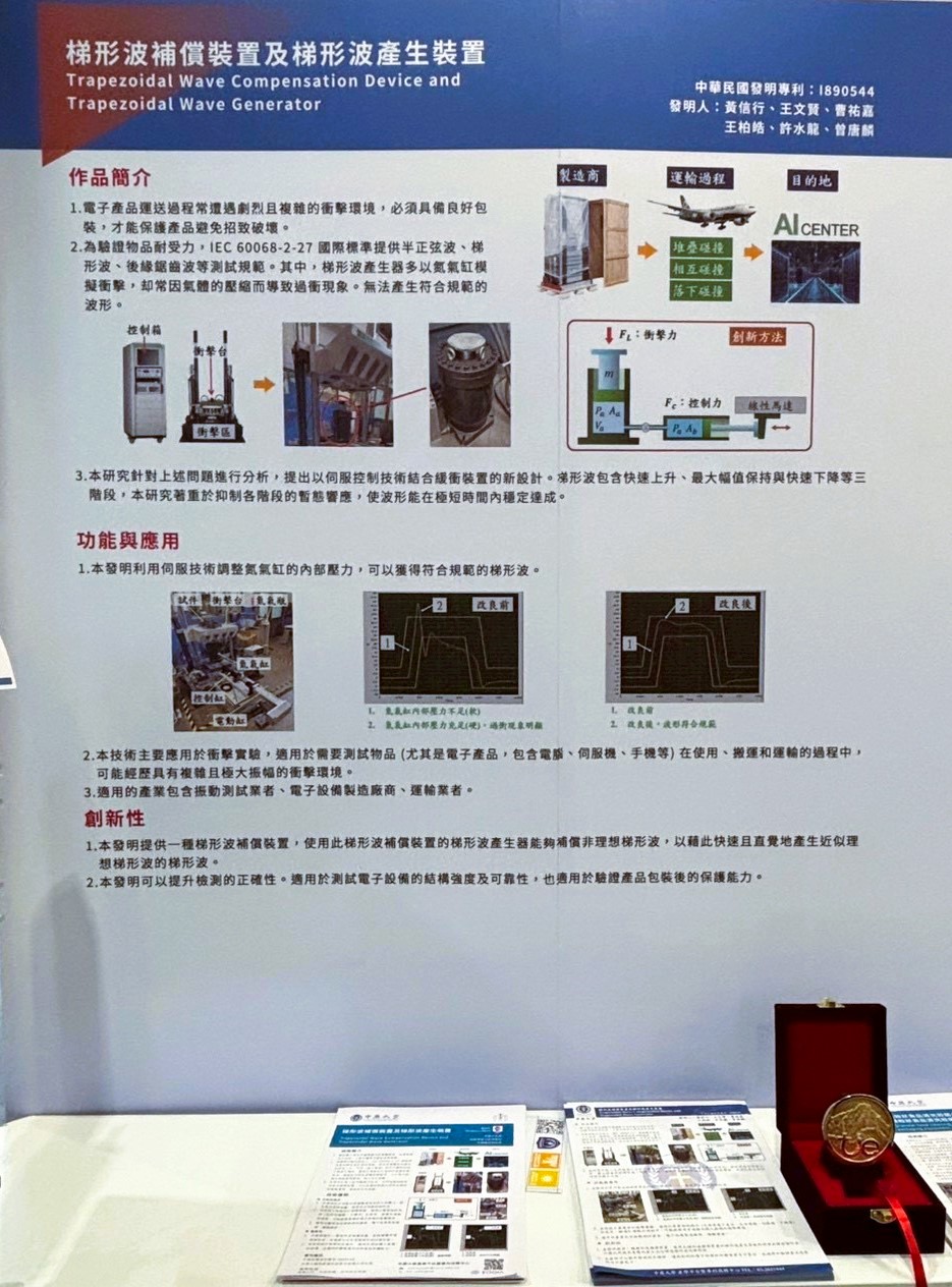 延續創新精神,黃教授於2025年再度領軍參賽,憑藉發明專利【梯形波補償裝置及梯形波產生裝置】(專利號:I890544)榮獲金牌獎,並以【顆粒狀食品清洗殺菌分裝設備及顆粒狀食品清洗殺菌方法】(專利號:I814553)榮獲銀牌獎,再次獲得評審肯定。