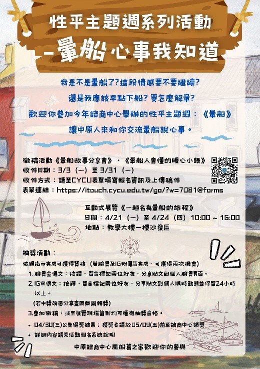 歡迎你參加今年諮商中心舉辦的性平主題週:《暈船》,讓中原人來和你交流暈船說心事。