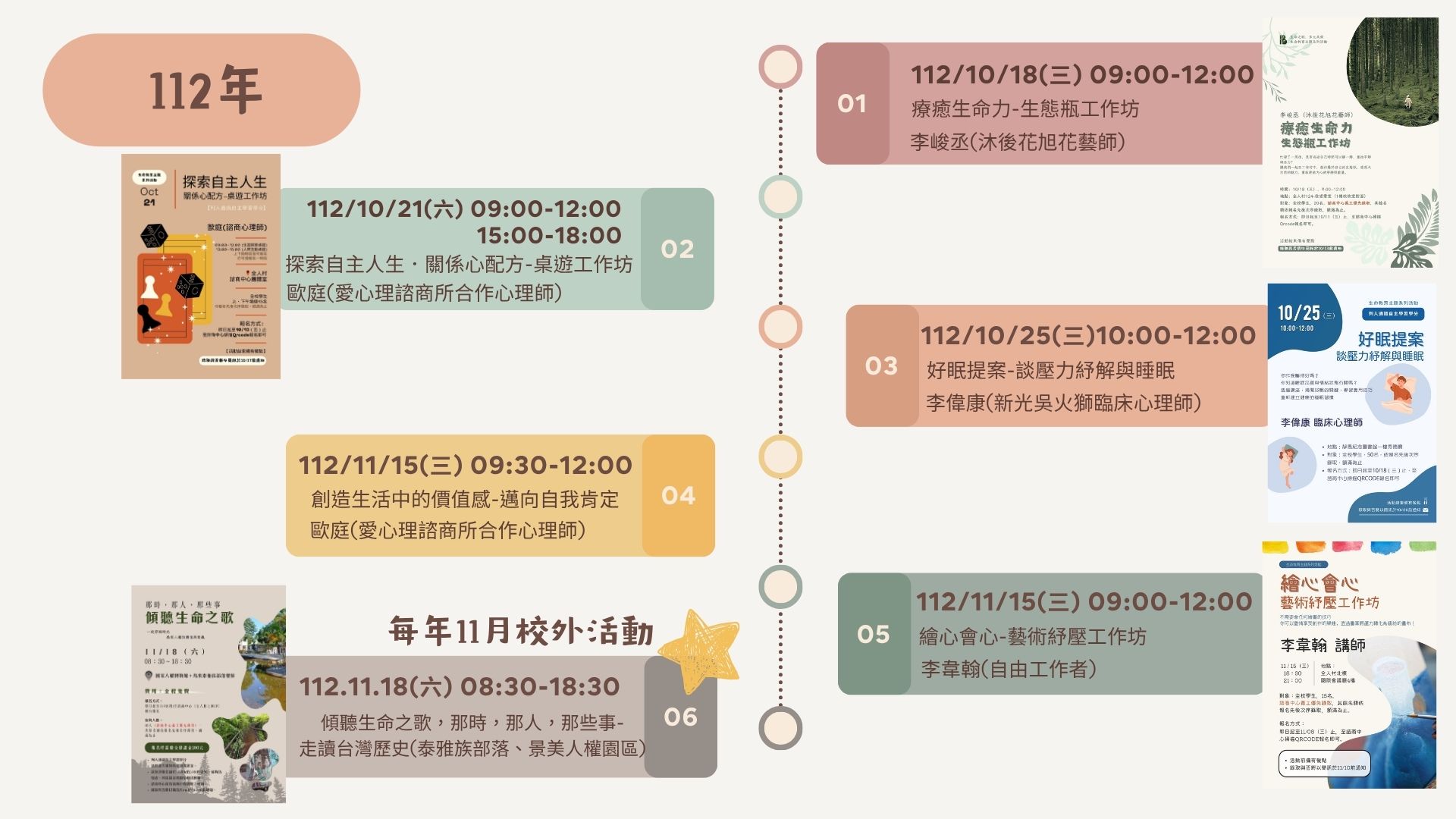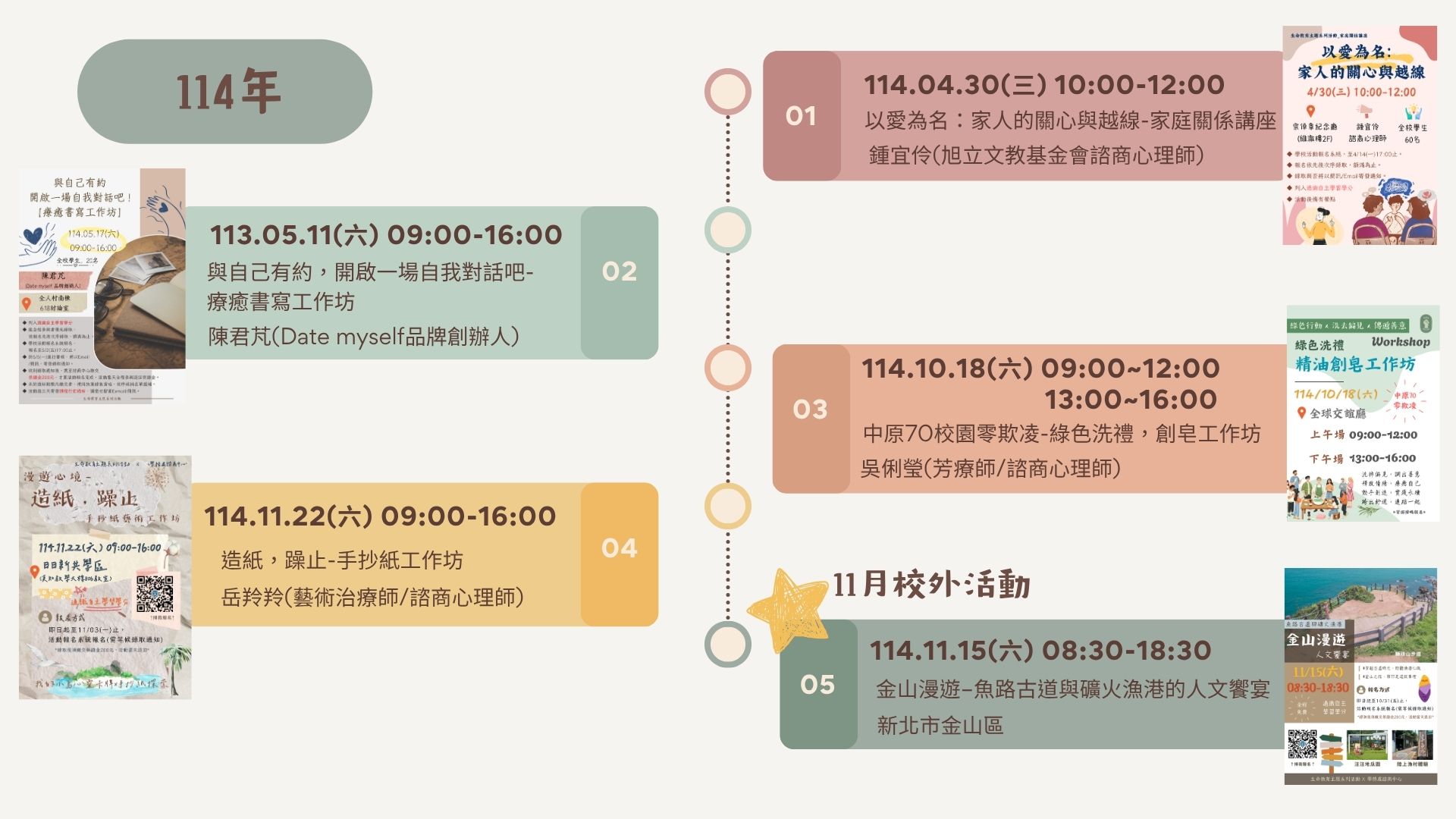 中原大學辦理學生事務與輔導工作特色主題計畫三年中長程發展計畫,112至114年以「營造友善校園並促進學生自我實現」為願景,期許學生在成年前期的大學階段,依「個人關懷」與「社會環境關懷」兩向度主軸,由內而外的思辨自我狀態、人我關係、人境關係,引導學生在自我實現的同時也發展對所處的社會、環境的興趣,共同營造友善校園。
