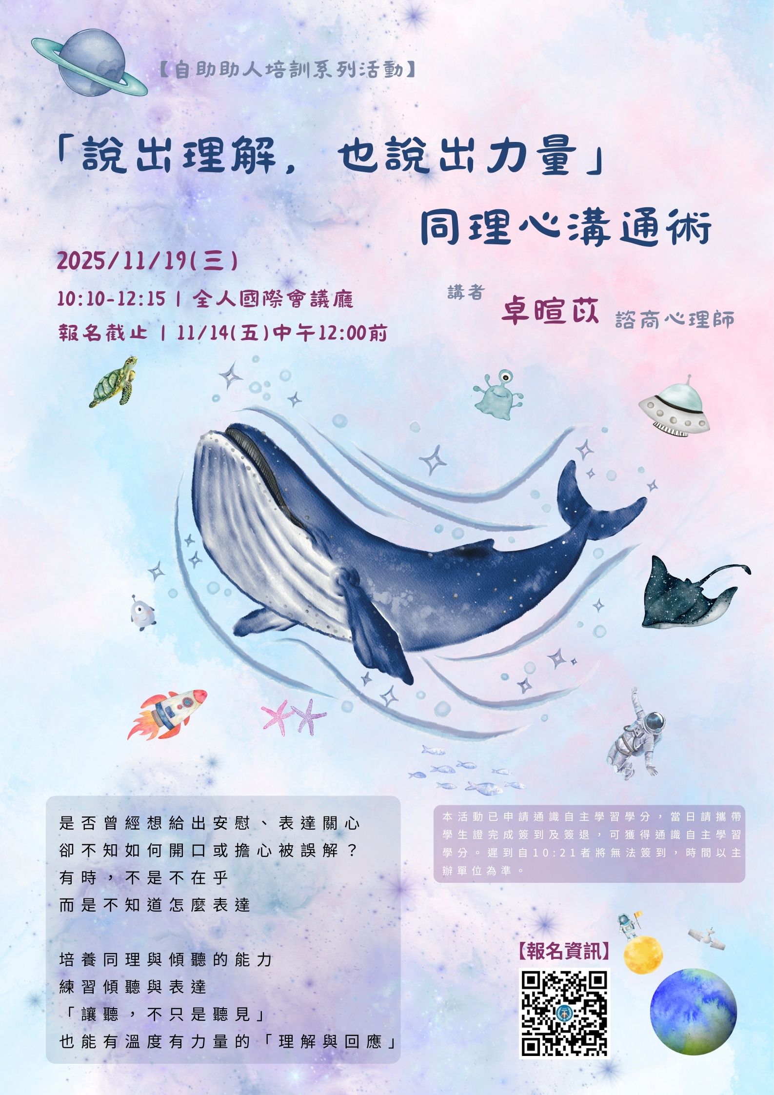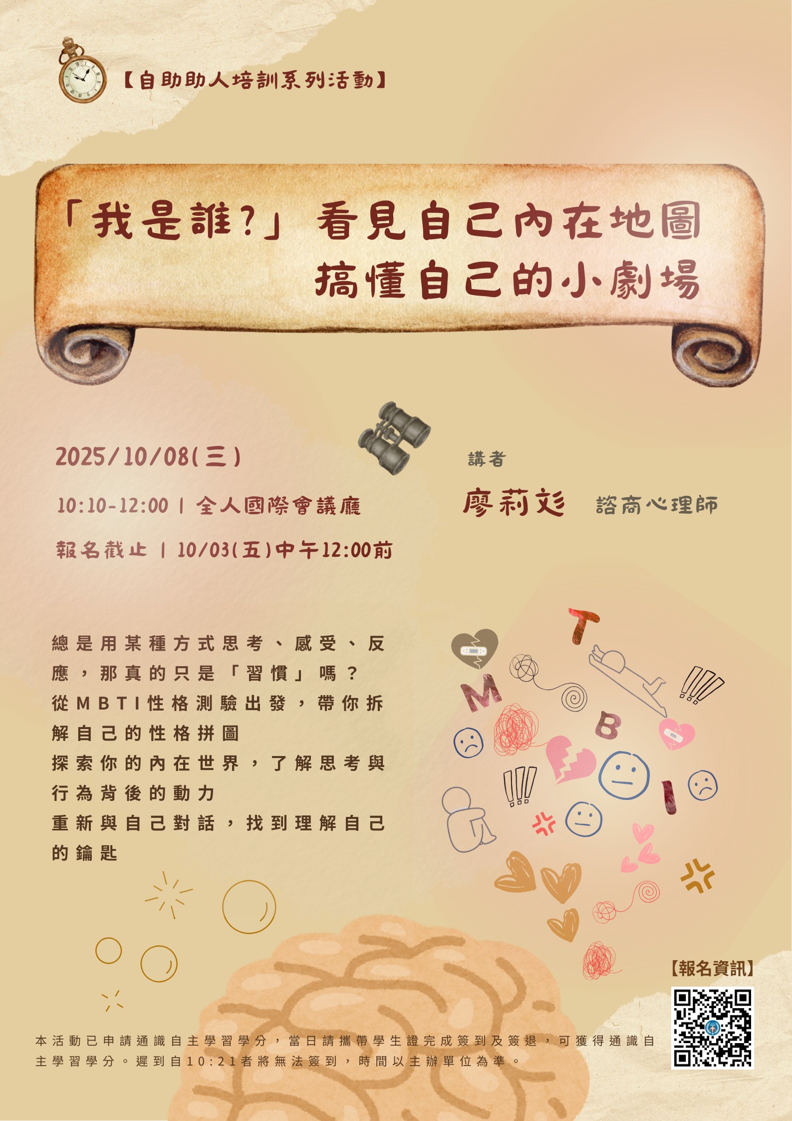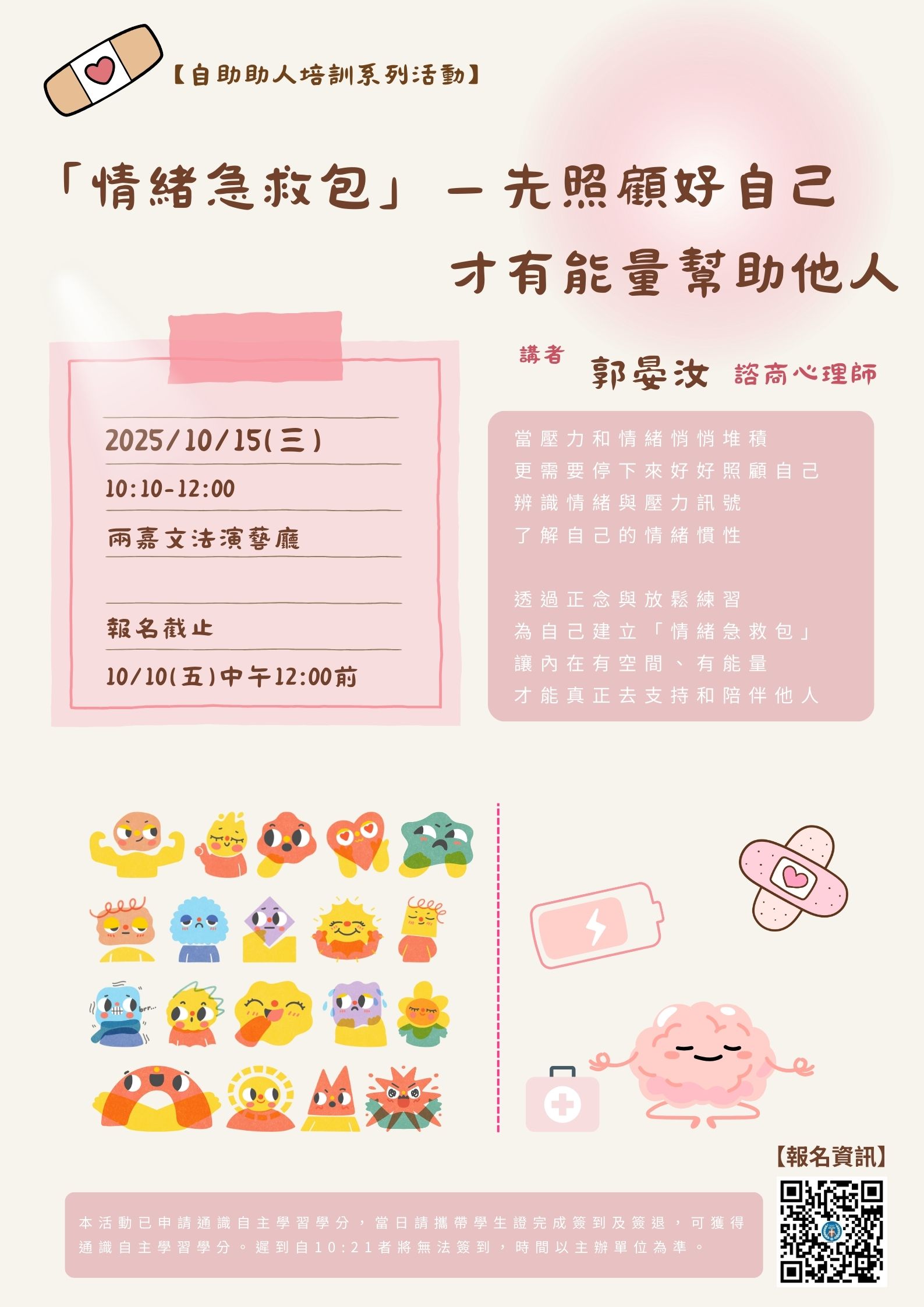 你是否希望在人生的路上,更懂得照顧自己的情緒,也更有能力陪伴他人? 這是一場關於認識自己、理解他人、建立連結的學習旅程。透過實用的心理工具與溝通練習,將帶領你打造一個屬於自己的「自助助人」工具箱,讓您從「自我照顧」到「成為同儕支持者」循序漸進擁有「自助助人」的能力。