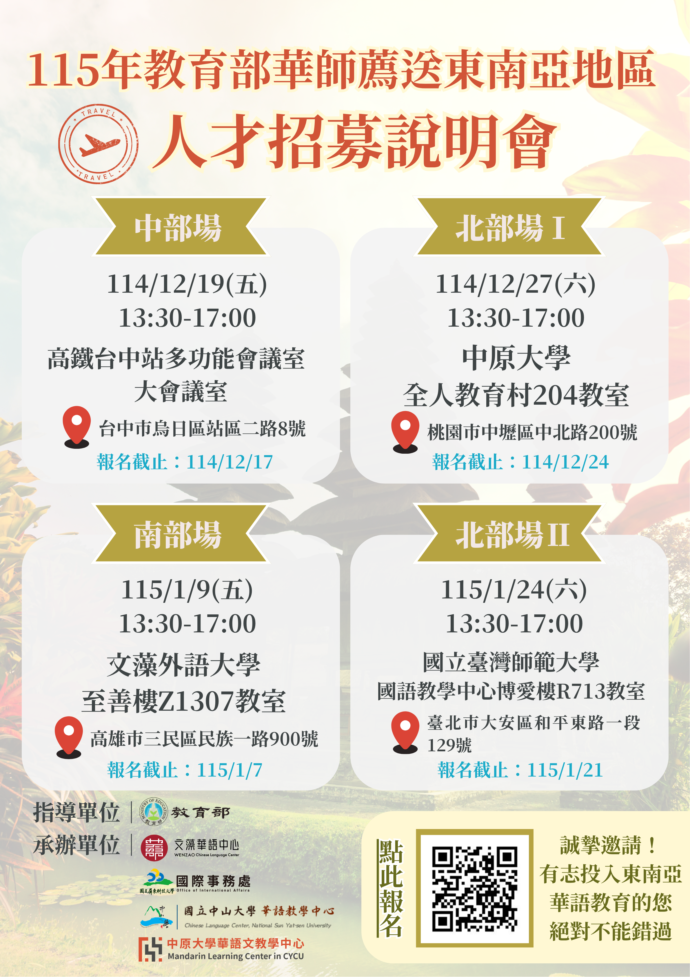 華師薦送東南亞地區計畫 -印尼華師薦送 計畫簡介 印尼為東協人口最多的國家,總人口已超過 2.7 億人,其中華裔人口約 1200 萬至 1500 萬人,約佔印尼總人口的 3% 至 5%,也是全球華人人口最多的國家。根據教育部統計,近年在臺灣就讀的印尼學生人數持續成長,總數已突破 2 萬人,在外籍學生中排名前二,包含學位生、交換生、短期研修生及華語生,其中華語生人數僅次於越南。隨著印尼各地華語教育快速發展,對專業師資,特別是教學實務與數位教學應用能力的需求日益增加。臺灣師資不僅能協助提升當地學生華語能力,更能帶動本地教師專業發展。建立具「臺灣品牌」特色的華文教師研習課程,也是我們持續於印尼華文教育深耕的重點。本計畫前期主要聚焦雅加達地區,後期則將逐步拓展至泗水、萬隆及日惹等地。新年度除積極開拓新職缺外,亦將鞏固以往合作穩定的學校。現階段維持合作的學校包括培民學校、泗水臺灣學校、雅加達臺灣學校、慈育大學、彼得拉基督教大學、穆罕默迪亞日惹大學等,皆為經驗豐富的教育夥伴。中原華語教育團隊多年來曾前往棉蘭、萬隆、三寶壟、雅加達、泗水、日惹等城市之多所學校與大學交流,如培民學校、慈育大學、新加坡國民學校、Gloria School、Nation Star Academy、泗水臺灣教育中心等,累積豐富的在地經驗。亦積極運用數位學習資源,辦理線上教師研習與青年華語研習班,持續服務印尼數百位師生,課程成效獲得高度肯定。 115年 華師薦送東南亞地區 說明會 教育部為推廣我國優質華語教學及臺灣文化,補助優秀華語教學人員赴國外學校任教,以提高我國在海外華語教學領域之影響力。歡迎有興趣前往東南亞教華語的老師一起加入我們的行列! 我要報名 114年 華語教師赴印尼任教通告 申請資格 基本資格具中華民國國籍,且在臺灣地區設有戶籍,符合下列各款華語教學人員各目規定之一者:(1) 具有教育部對外華語教學能力證書。(2) 於我國立案之公私立大學或符合本部採認規定之國外大學畢業,取得學士以上學位證書,符合本部對外華語教學能力認證作業要點第二點規定之外語能力條件,並具有對外華語教學經驗。專業要求符合下列規定之一:(1) 具對外華語教學經驗,班級教學時數滿50小時。(2) 修滿對外華語教學學分學程20學分。(3) 修畢華語文教學師資培訓班滿120小時。相關經驗要求具5年以上華語教學相關工作經驗。其他要求具良好外語溝通能力,英語或印尼語尤佳。(請提供外語種類及程度)請自行考量印尼及校園生活環境差異,具適應能力及應變能力者尤佳。※各校需求詳見附件一覽表。 福利待遇 教育部補助項目1. 聘期內每月生活補助費1,700美元,依實際任教天數核給。2. 初次應聘時,補助臺灣至印尼往返最直接航程經濟艙機票1張(實報實銷,補助款上限750美元)。3. 初次應聘時得補助1次教材教具費300美元,第二年續聘不予補助。※各校福利待遇詳見:〈華語教師赴印尼任教學校一覽表〉 相關文件 教育部114年華語教師赴印尼任教通告.PDF114年華語教師赴印尼任教學校一覽表.PDF114年華語教師赴印尼任教英文履歷表.ODT114年華語教師赴印尼任教志願排序表.OTD