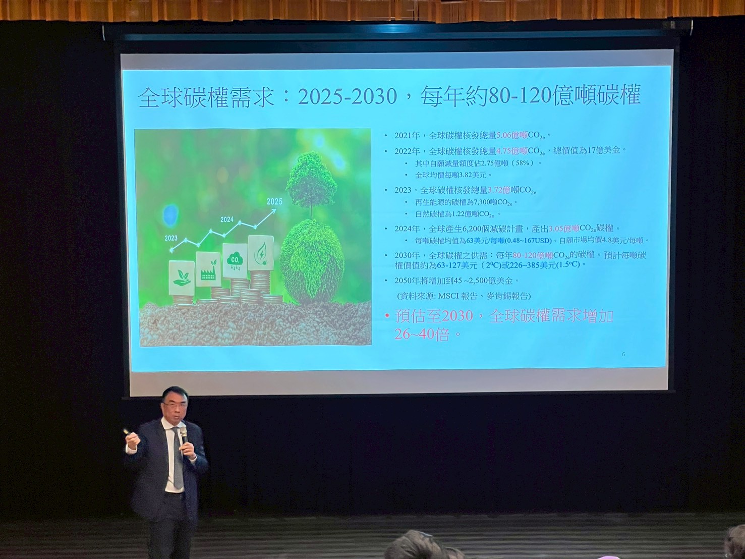 本次講座特別邀請蘇義淵法學博士,分享全球碳權市場最新趨勢,協助聽眾掌握未來淨零轉型的關鍵脈動。根據國際機構(MSCI、麥肯錫)資料,2021 至 2024 年全球碳權核發量已由 5.06 億噸下降至 3.05 億噸 CO₂e,但 2025–2030 年需求卻將攀升至每年 80–120 億噸,預估較目前成長 26 至 40 倍,顯示供需缺口日益擴大。碳權價格亦將因減量路徑不同而出現大幅變動;2030 年每噸可達 63~127 美元(2°C)或 226~385 美元(1.5°C),2050 年市場規模更上看 45~2,500 億美元。
