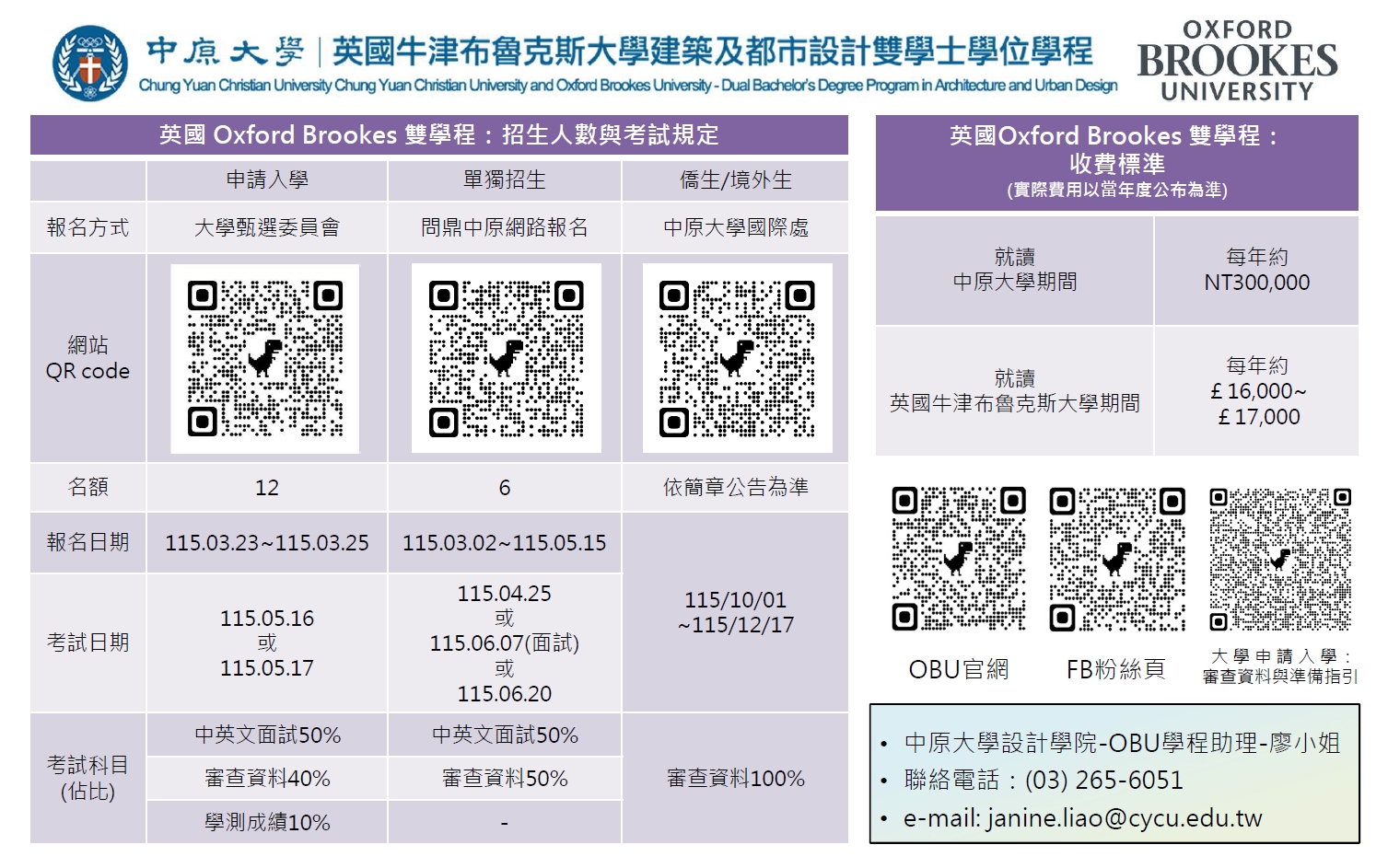 OBU專班招生人數與考試規定