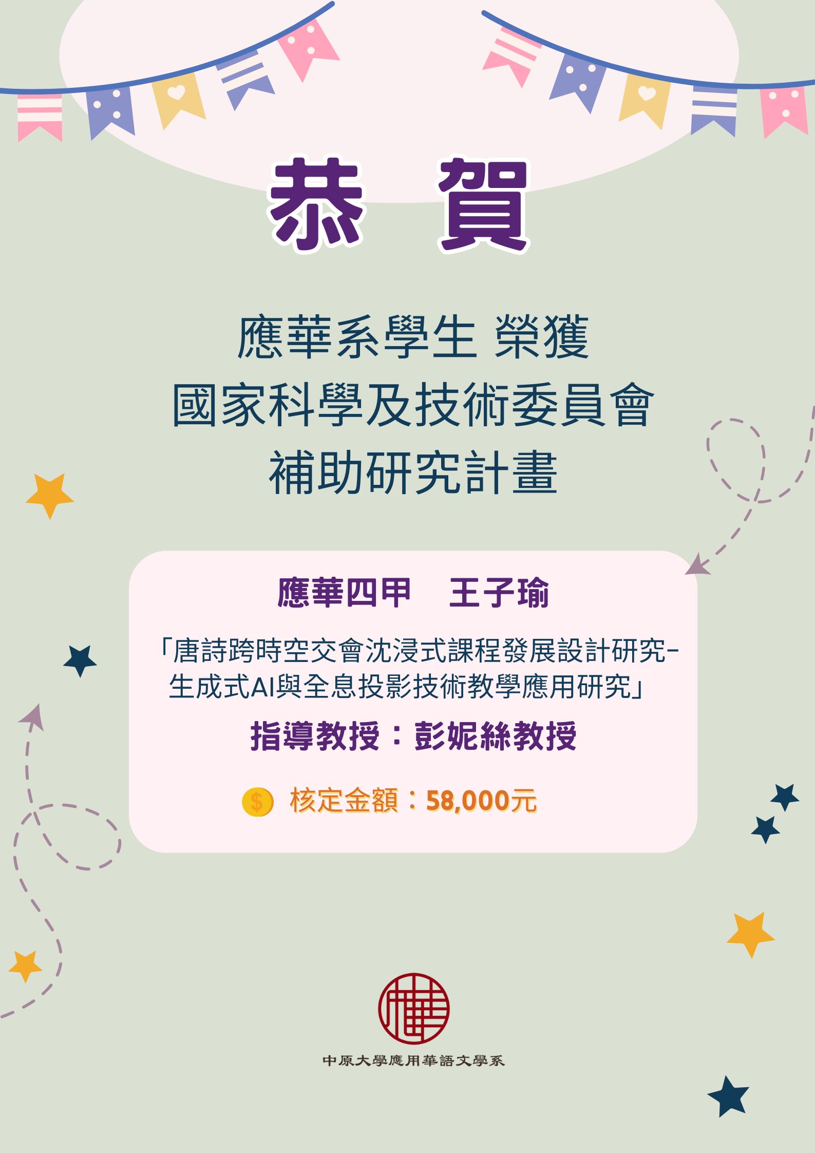 ★恭賀★應華四甲 王子瑜 榮獲國家科學及技術委員會補助研究計畫