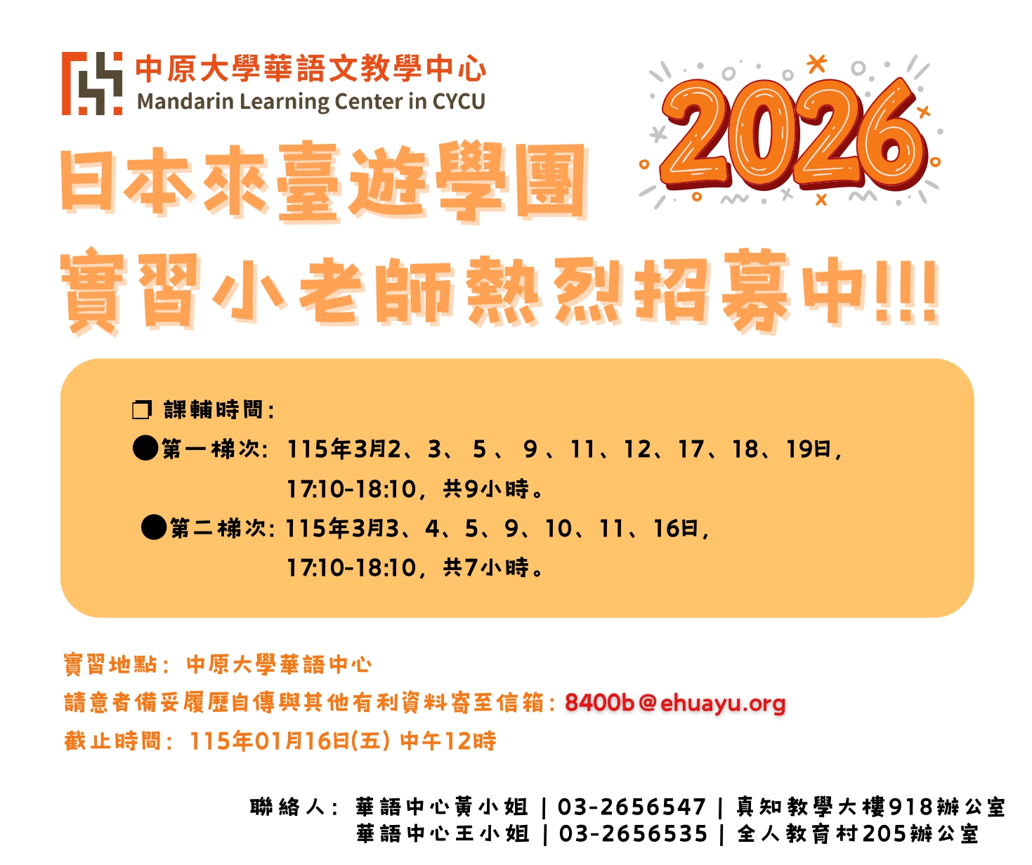 華語中心即將舉辦日本來臺華語文化遊學團,提供實習機會,誠徵多名小老師,報名截止日為115年1月16日(五)中午12:00前,歡迎有意願的同學踴躍報名參加,報名前請先詳見下述說明。。