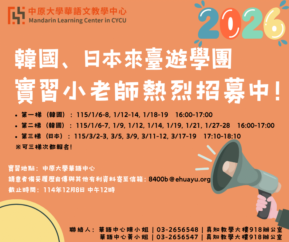 華語中心即將舉辦韓國、日本來臺華語文化遊學團,提供實習機會,誠徵多名小老師,報名截止日為114年12月8日(一)中午12:00前,歡迎有意願的同學踴躍報名參加,報名前請先詳見下述說明。