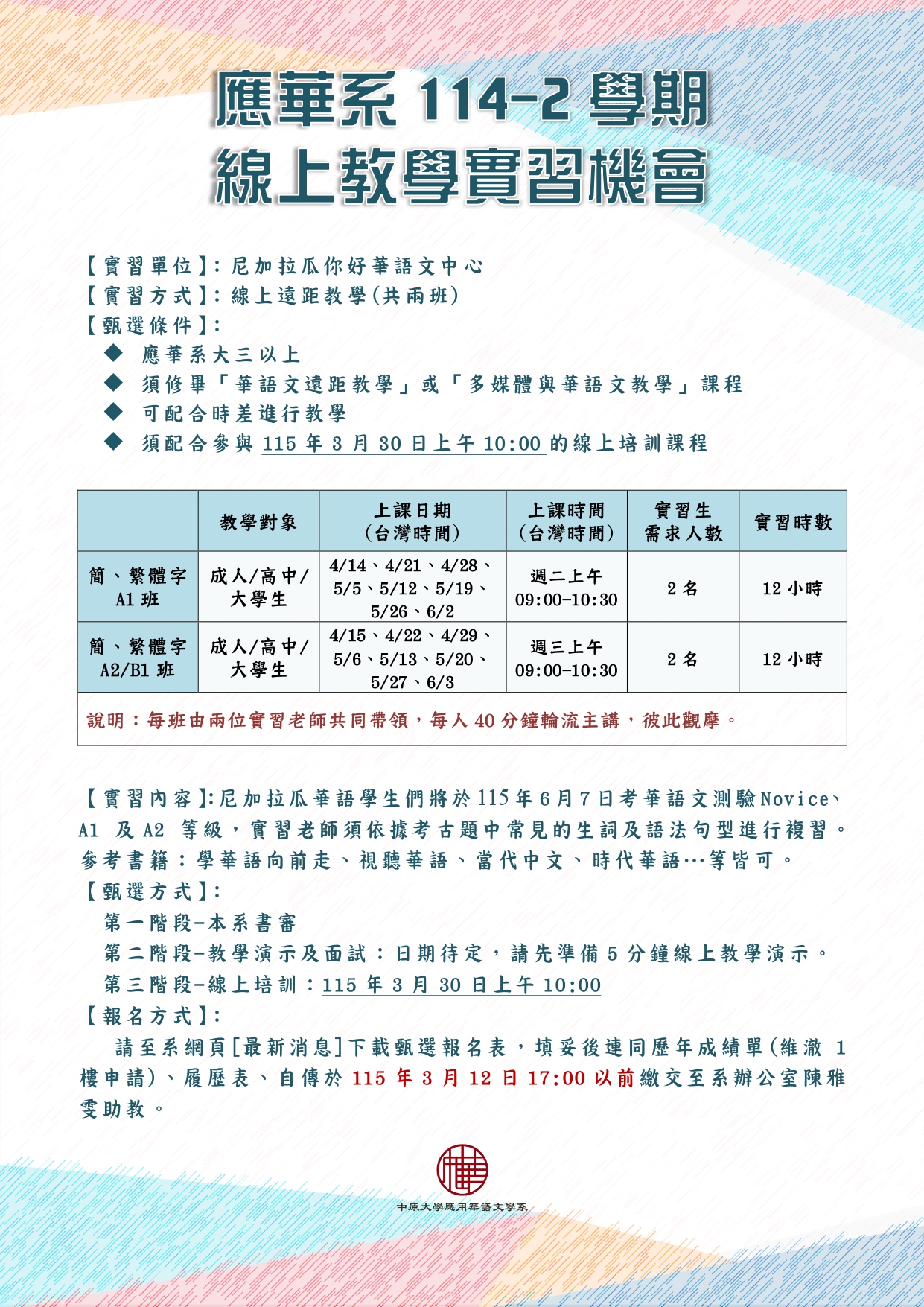 【海外實習-線上教學】114-2學期「尼加拉瓜你好華語文中心」線上教學實習機會4名,報名至115年3月12日17:00截止 中原大學應用華語文學系學生實習甄選報名表 中原大學應用華語文學系學生實習甄選作業要點