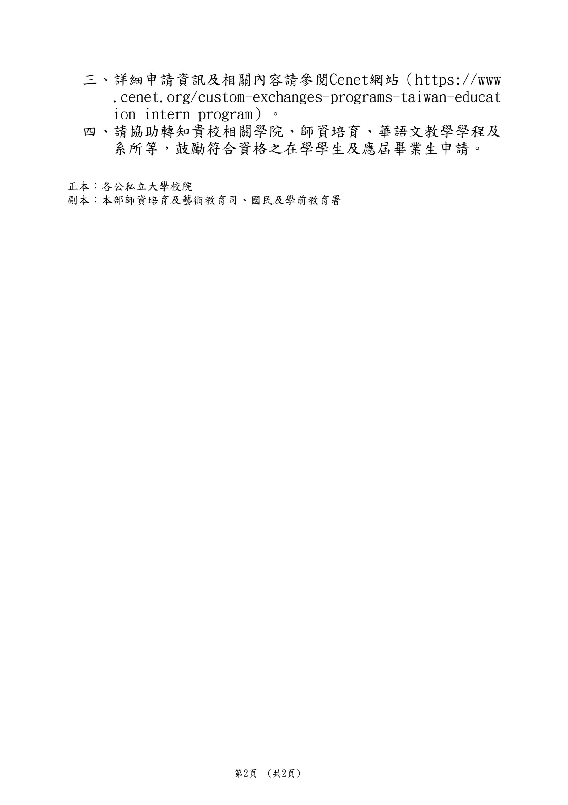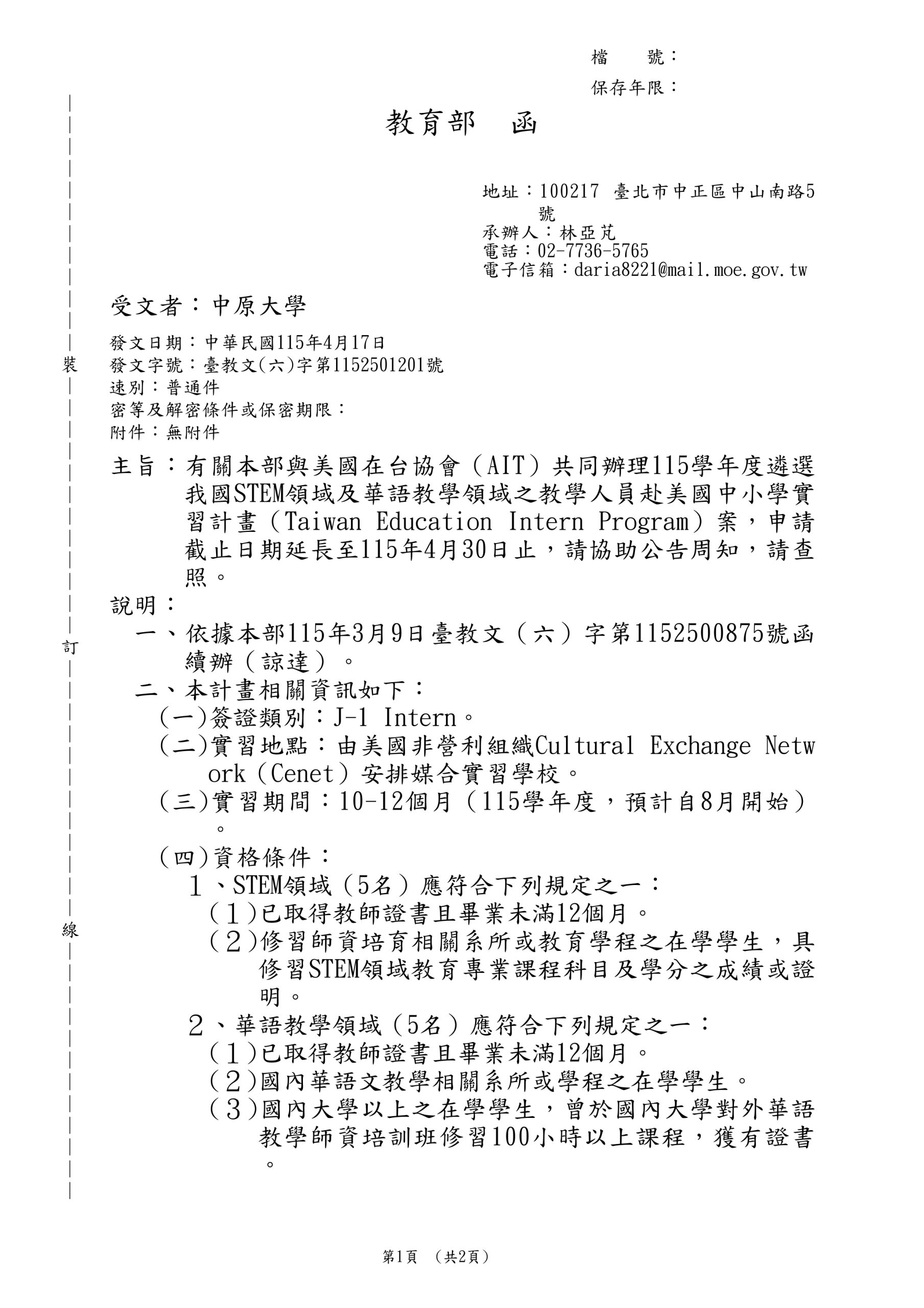【海外實習-美國】教育部與美國在台協會辦理115學年度STEM領域及華語教學領域之教學人員赴美國中小學實習計畫 詳細申請資訊及相關內容請參閱Cenet網站:https://www.cenet.org/custom-exchanges-programs-taiwan-education-intern-program