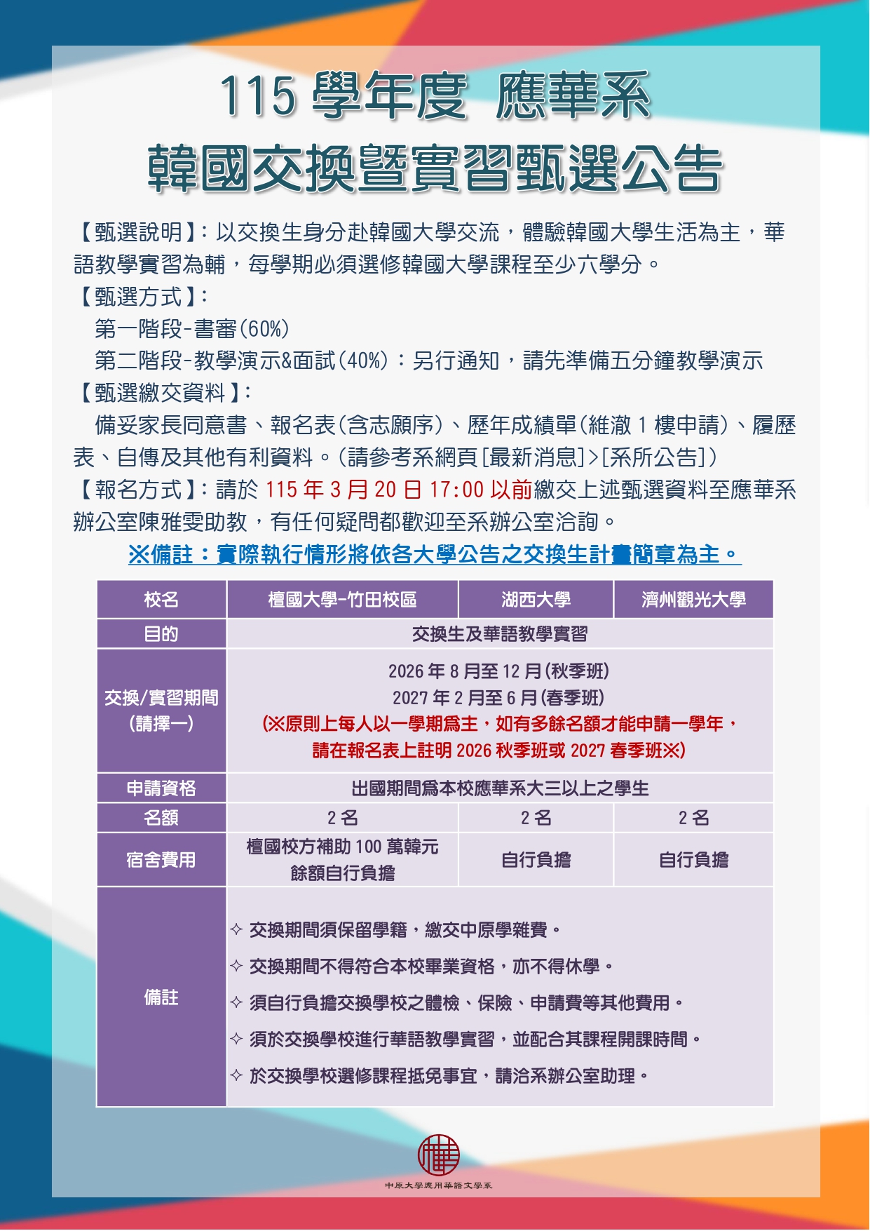 【海外實習-韓國】115學年度「韓國交換暨實習」實習機會6名,報名至115年3月20日17:00截止 中原大學應用華語文學系學生實習甄選報名表(交換暨實習) 中原大學應用華語文學系學生實習甄選作業要點 家長同意書(實習)
