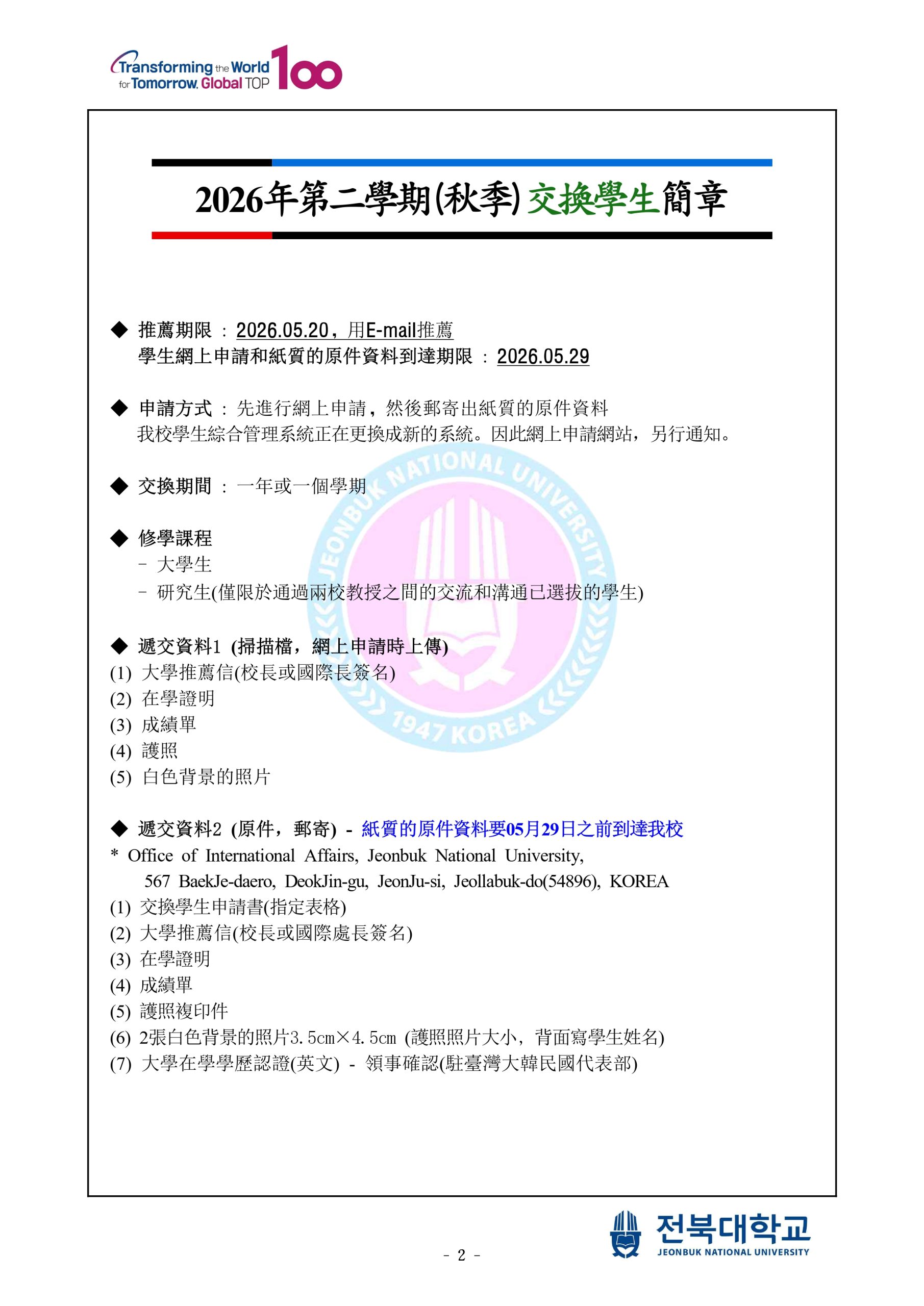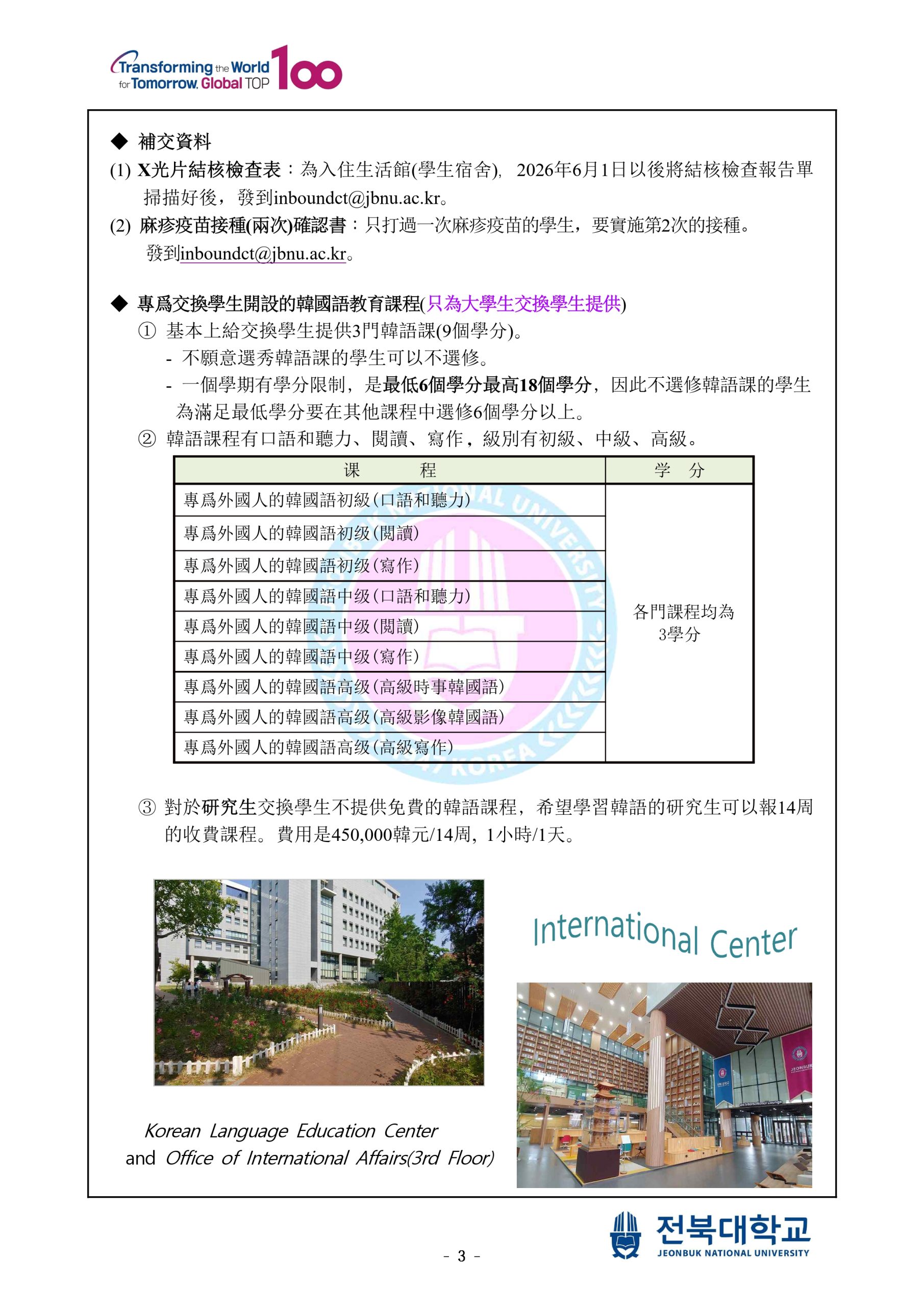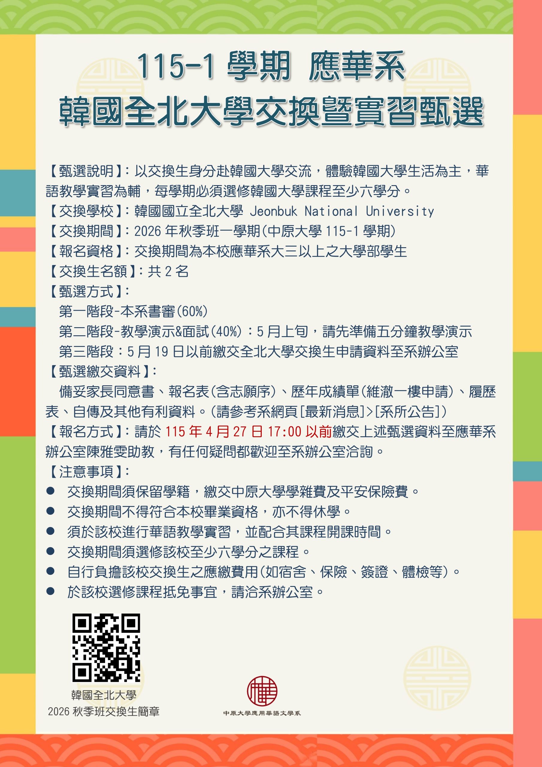 【海外實習-韓國】115-1學期「韓國全北大學」交換暨實習機會2名,報名至115年4月27日17:00截止 中原大學應用華語文學系學生實習甄選報名表 中原大學應用華語文學系學生實習甄選作業要點 家長同意書(實習)