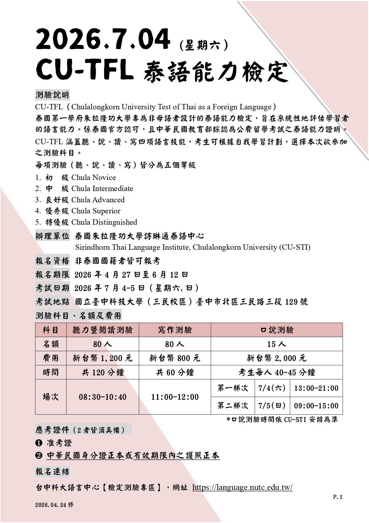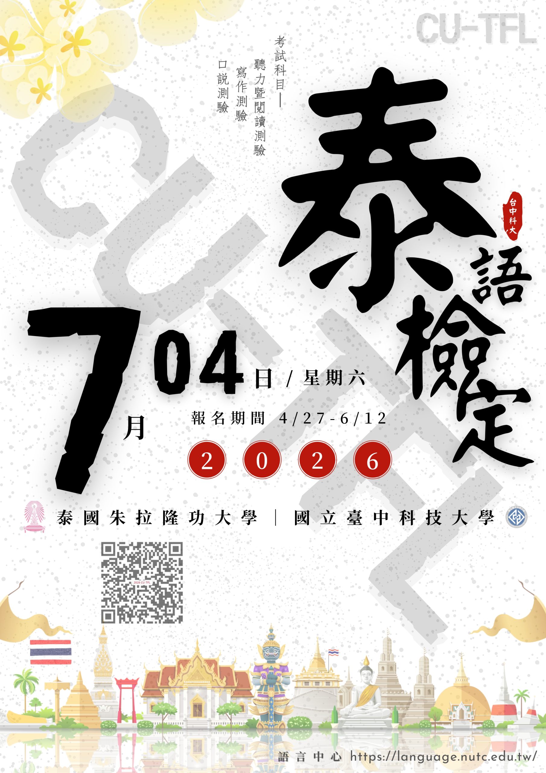 【語言測驗】國立臺中科技大學與泰國朱拉隆功大學合作辦理「CU-TFL泰語能力檢定測驗」