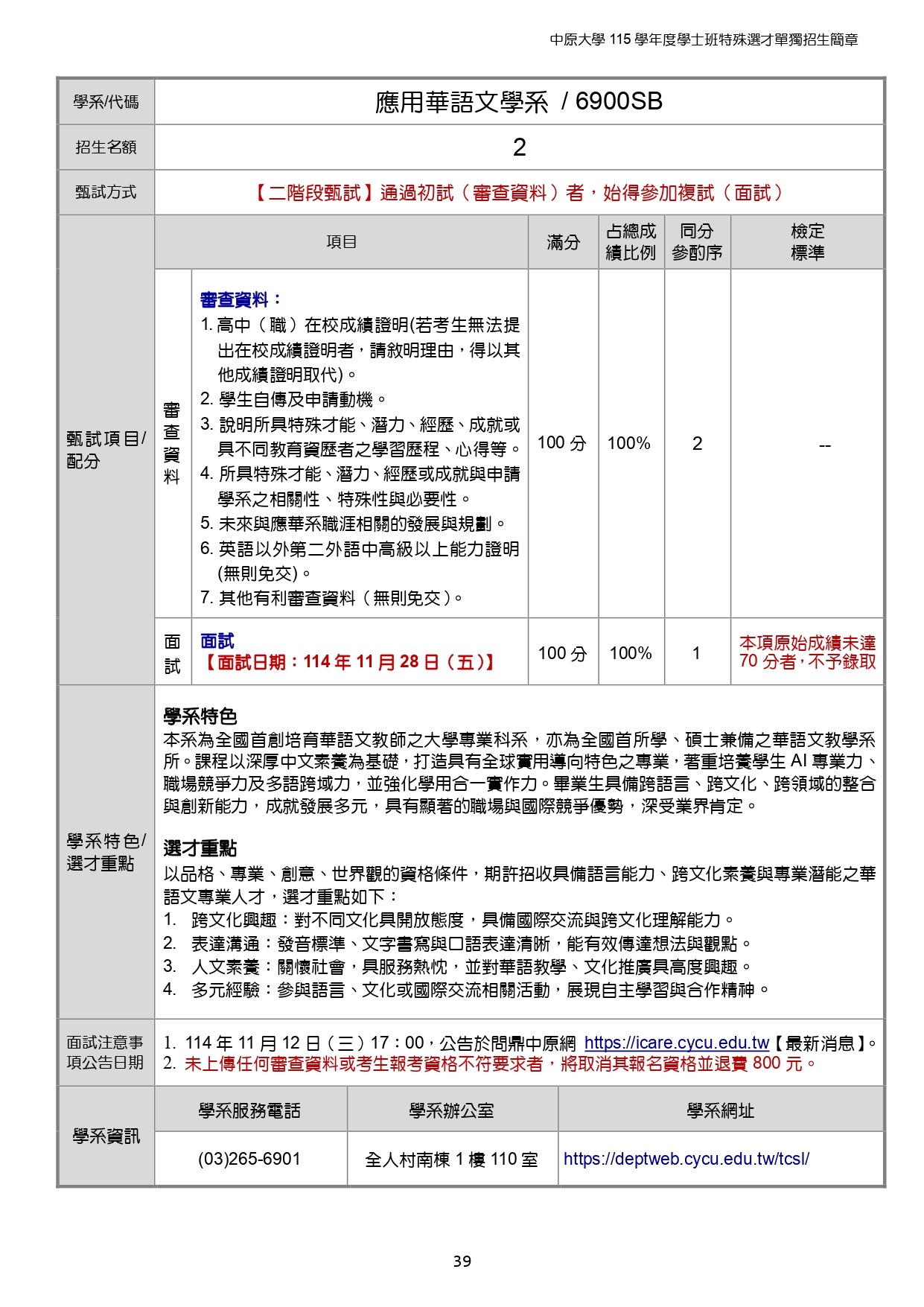 現在位置 : 首頁>招生專區>大學部招生資訊>特殊選才 115學年度大學特殊選才單獨招生報名期間:114年10月8日至114年10月27日中午止報名網址:https://icare.cycu.edu.tw/ 網路報名※相關資訊請見問鼎中原網:https://icare.cycu.edu.tw/ ,一切資訊以招生中心公告為準 系所招生聯絡人:蘇家崢助理 電話:03-2656901 傳真:03-2656949 電子信箱:sasa66@cycu.edu.tw 115學士班特殊選才單獨招生簡章 中原大學招生專區 高中生專區 認識我們 聯繫方式 入學資訊 課程資訊 實習資訊 系所活動 獎助學金 未來規劃 系學會FB 交通資訊