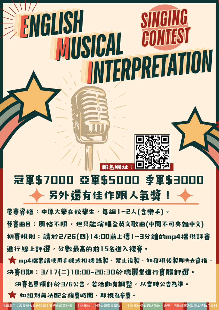 Eligibility: Current students of CYCU, with 1-2 performers per team, including musicians (if applicable)